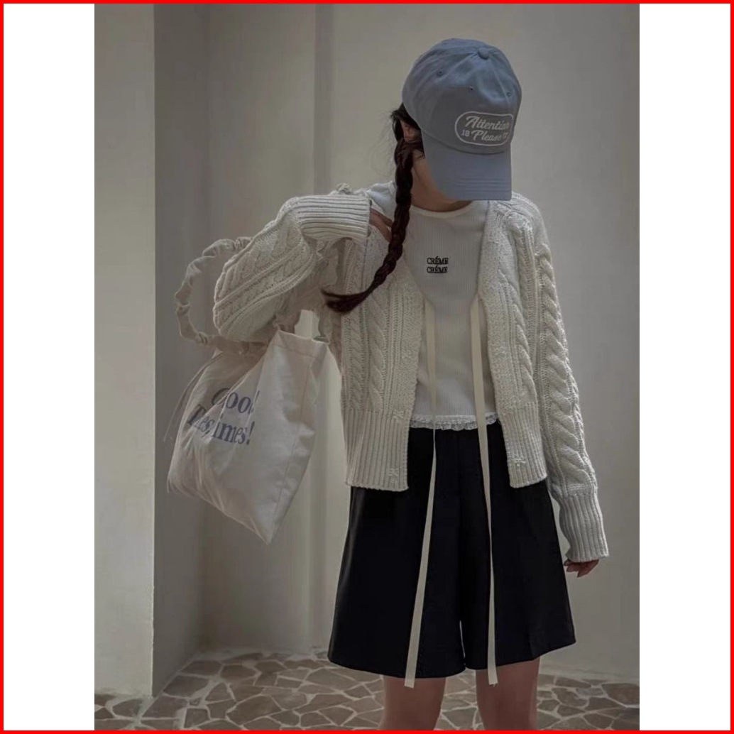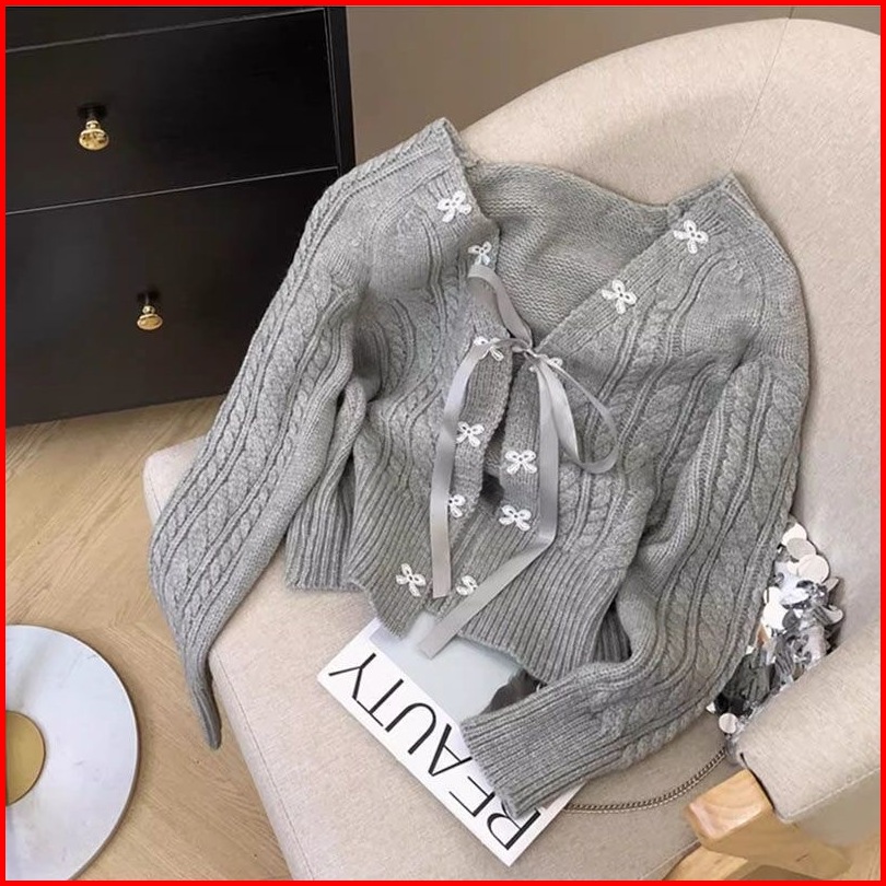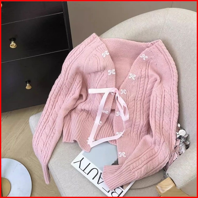 Kardigan Rajutan Kabel Leher V Simpul Pita Atasan Lengan Panjang Berenda Yang Longgar Dan Anggun