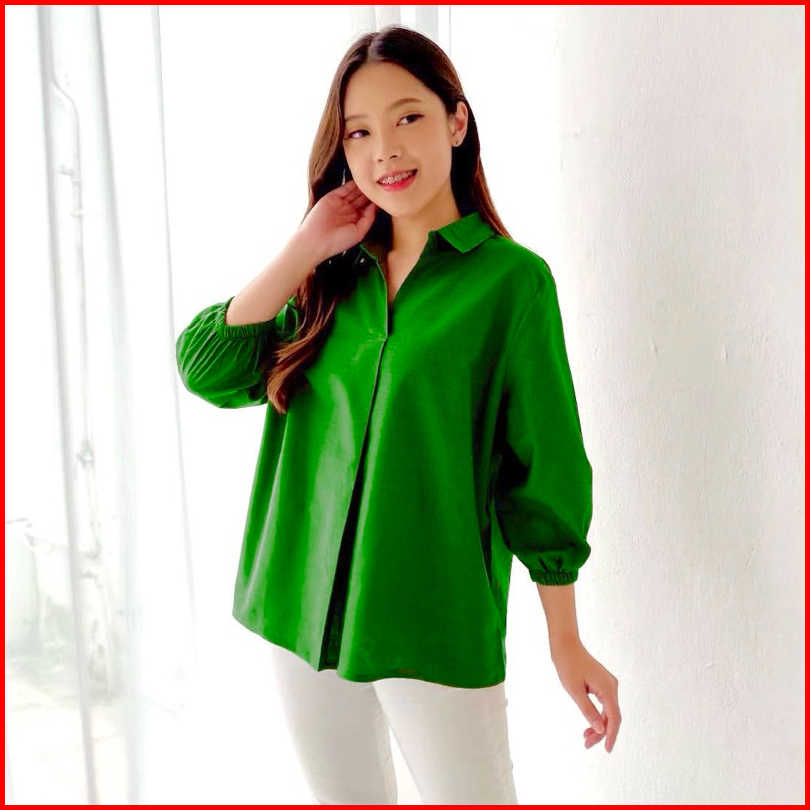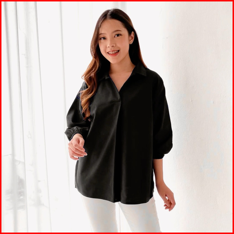 Ycl Dorena Top - Atasan Wanita V Neck Lengan Karet 3 4 Katun Poplin Hq Blus Kasual Wanita Atasan Basic Kasual Wanita