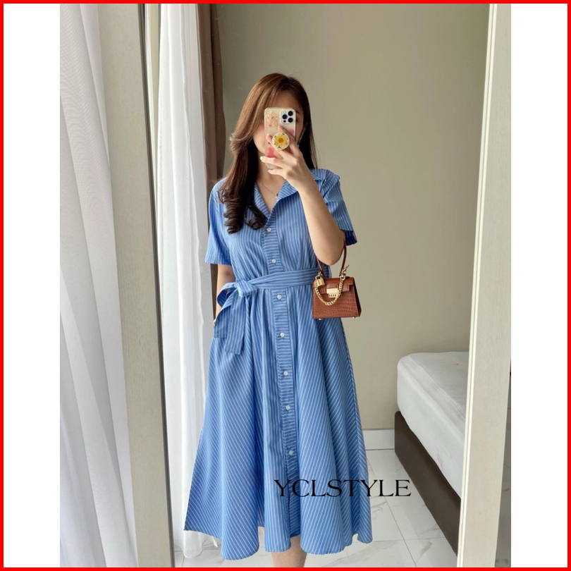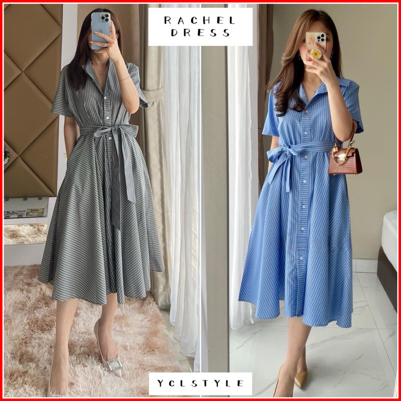 Rachel Midi Dress - Dress Salur Tali Pinggang Katun Premium
