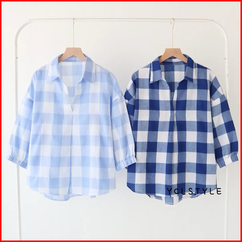 Gemi Blouse Vneck Motif Kotak Katun Premium Korean Minimalis Retro