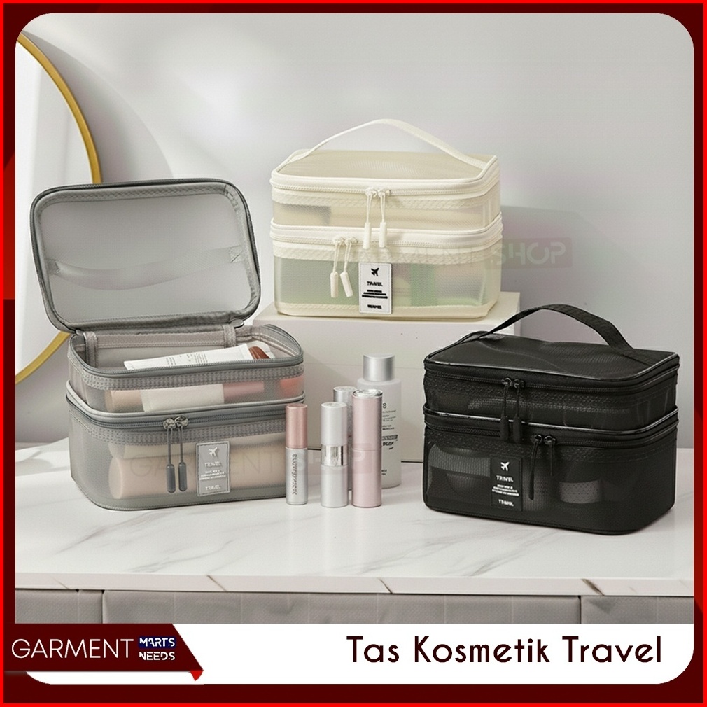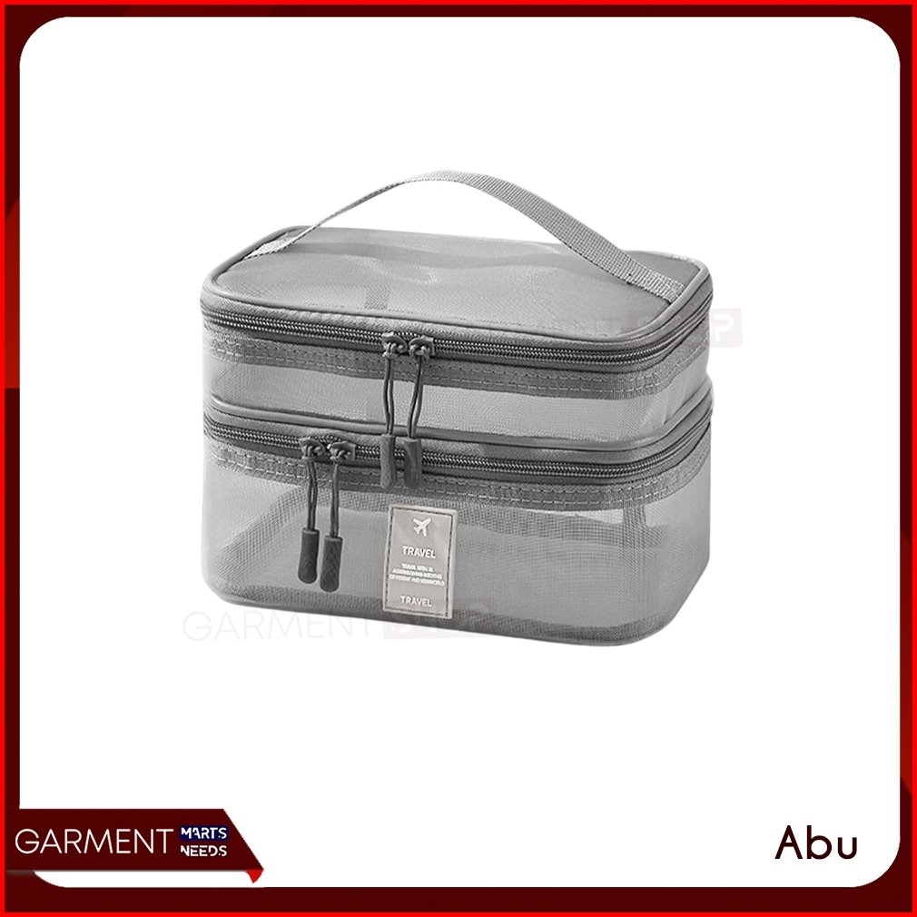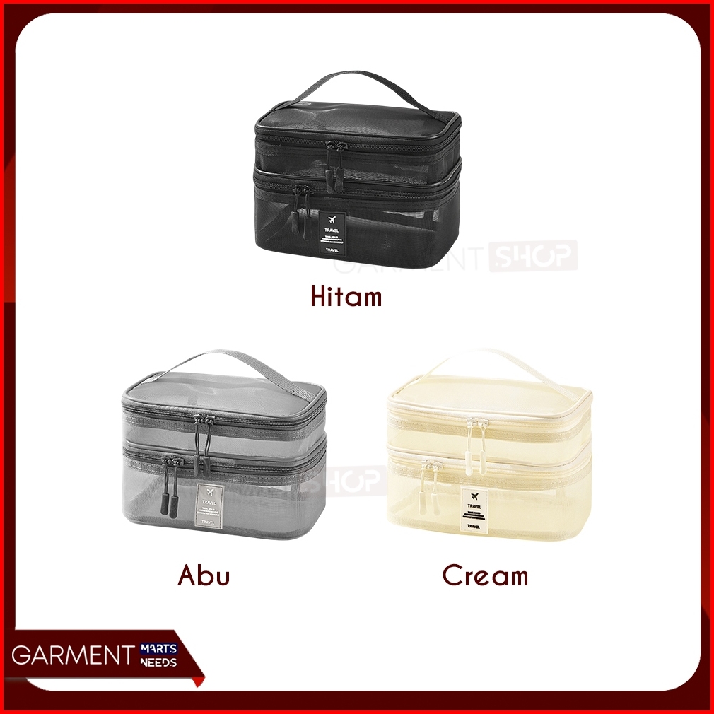 Tas Kosmetik 2 Tingkat Organizer Makeup Skincare Transparan Mesh Portable Pouch Handle Praktis Elegant
