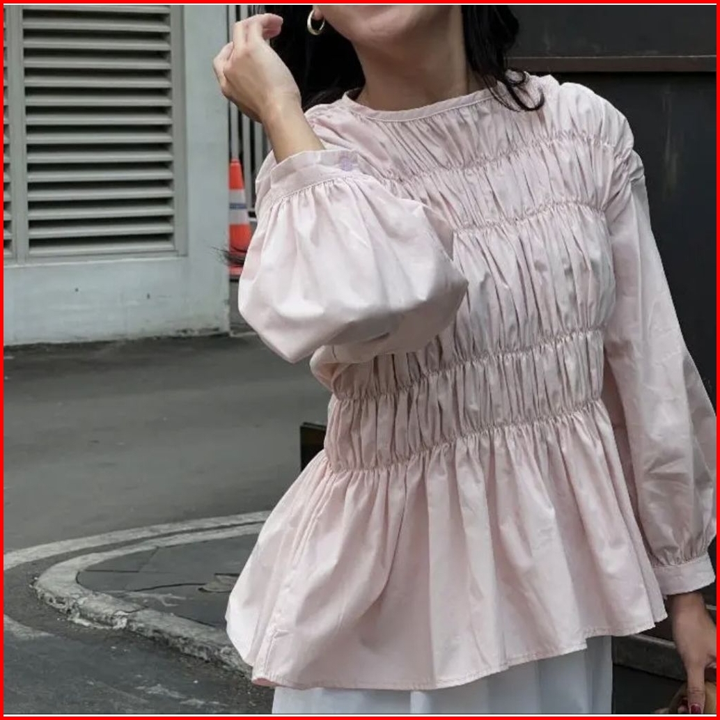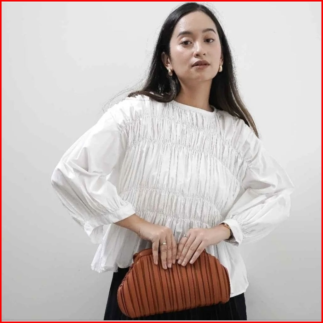Pamela Shired Blouse - Atasan Kerut Wanita Kekinian - Kemeja Blouse Lengan Panjang Casual Korea