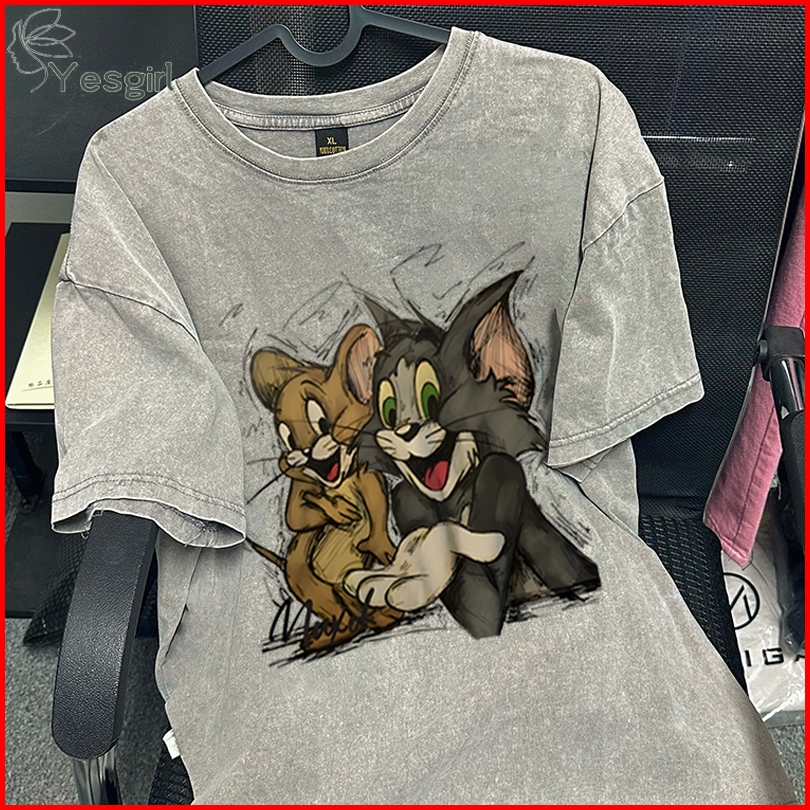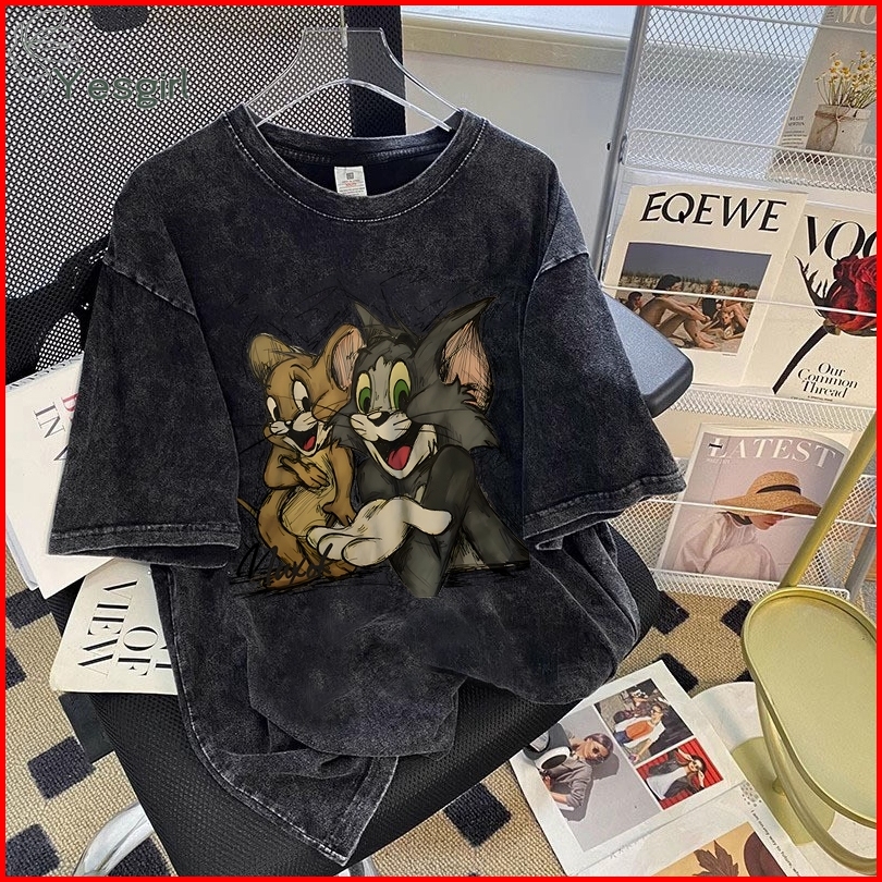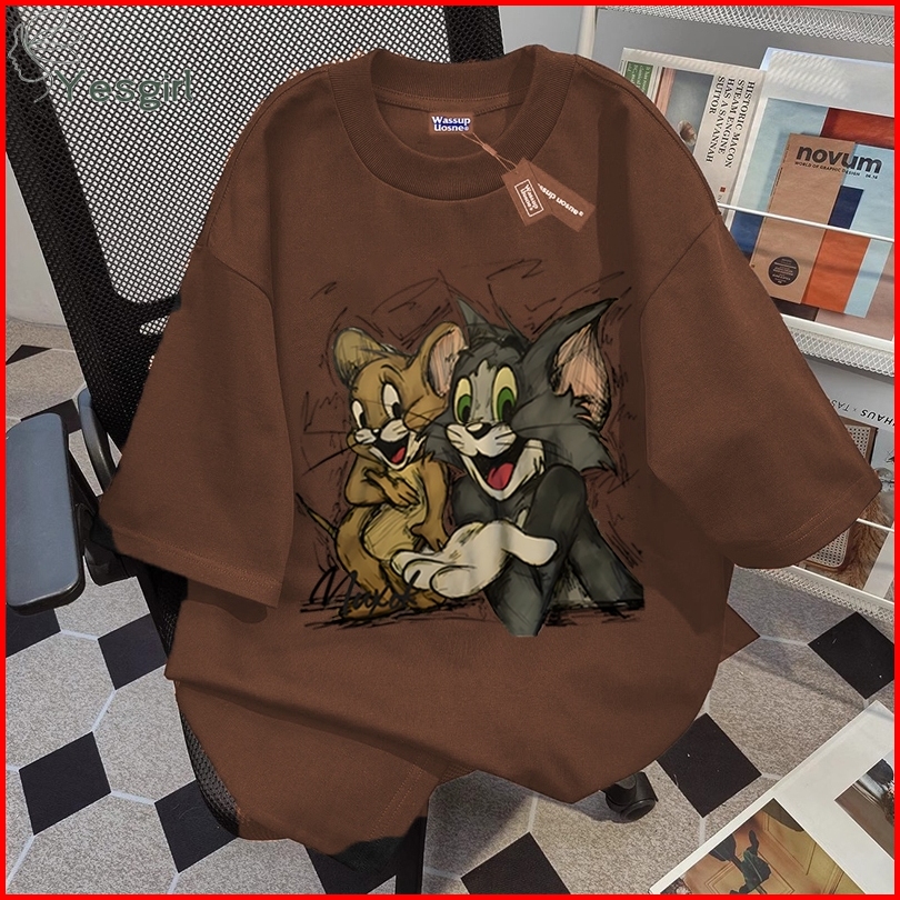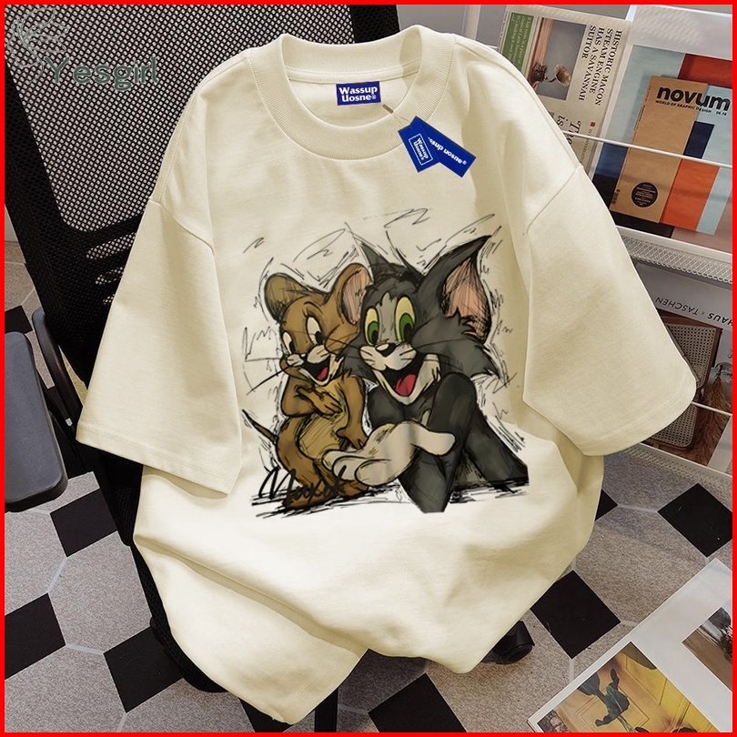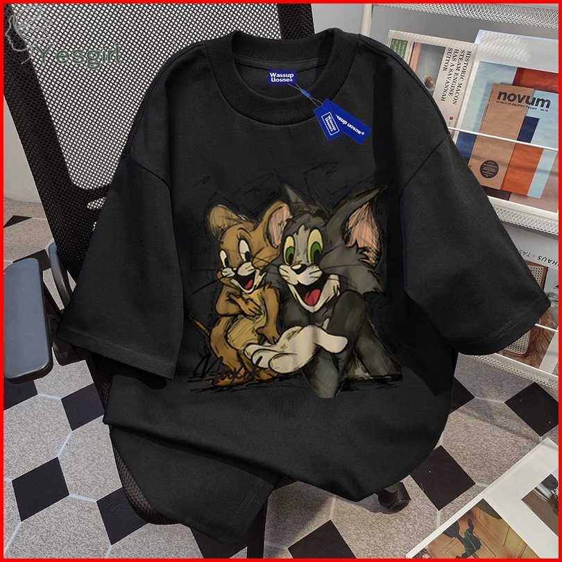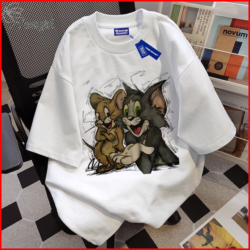 Yesgirl Korea Style Tom Dan Jerry Print Kaos Kasual Longgar Kaos Oversize Wanita Fashion Korean Style Baju Kaos Oversize