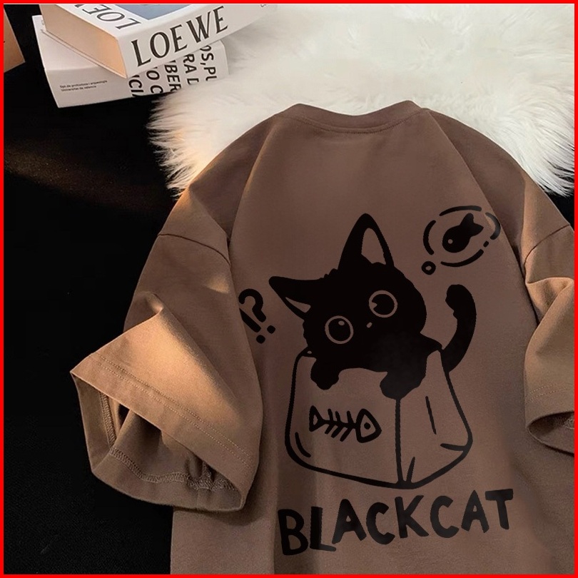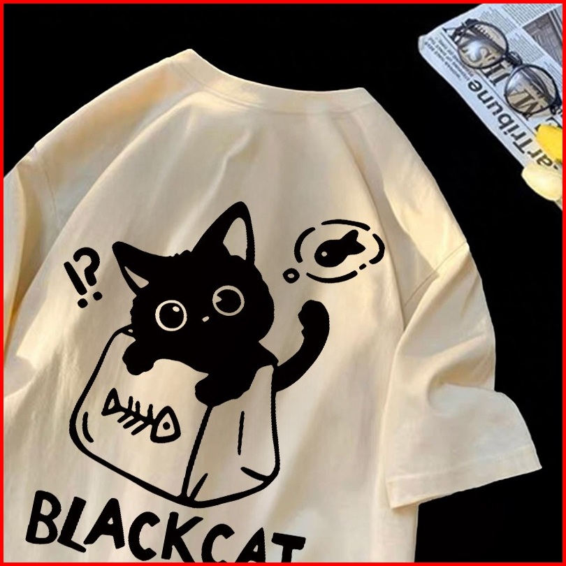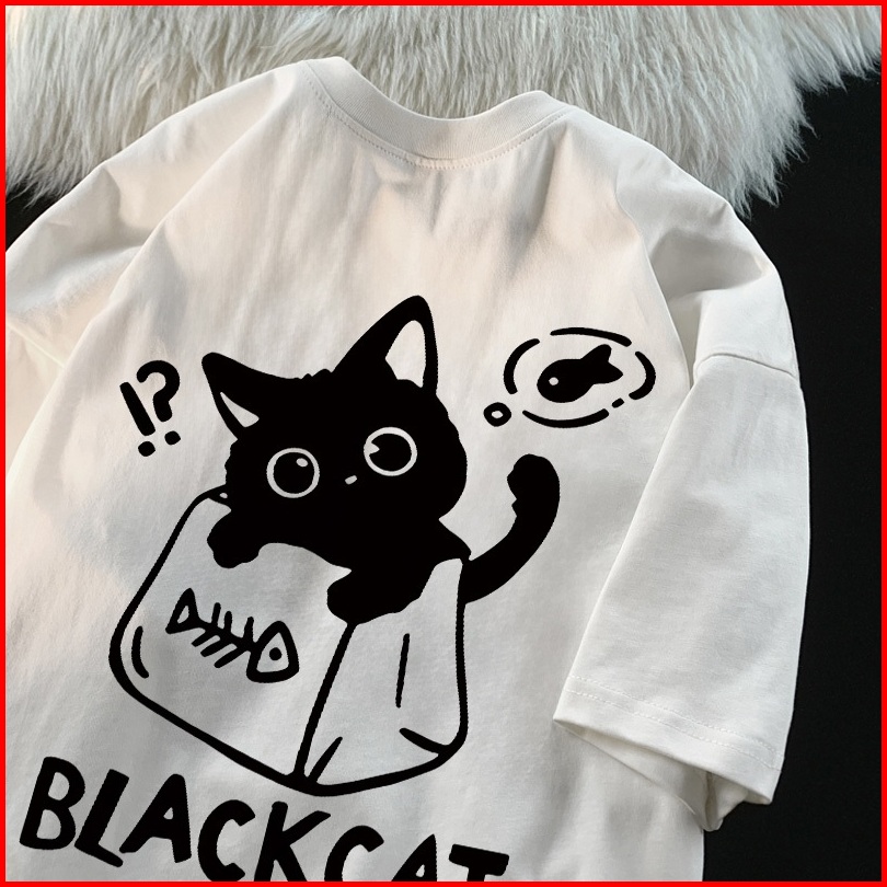 Forteid T-shirt Washed Oversize Cute Black Cat Print Baju Atasan Lengan Pendek Wanita Kaos Oversize Terbaru Kaos Lucu