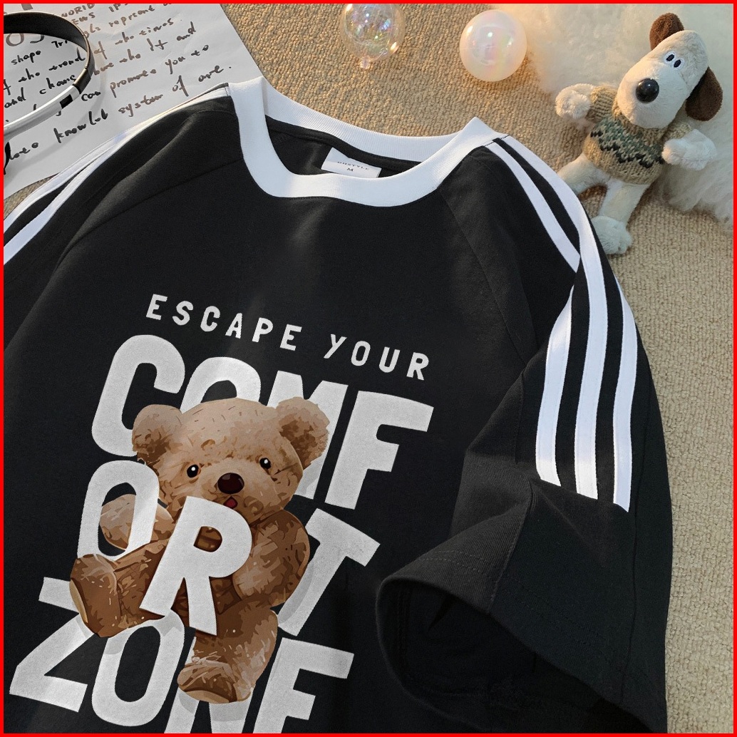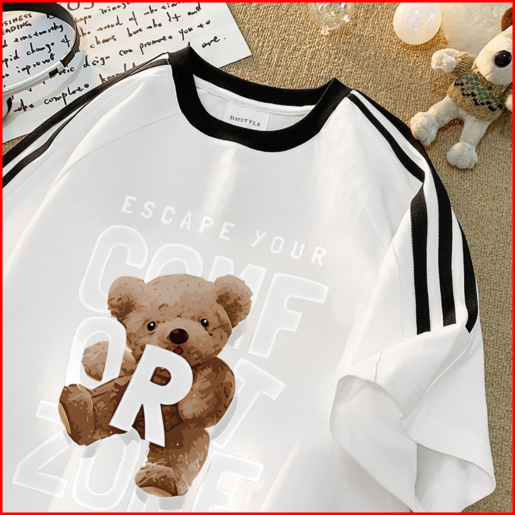 Forteid Cetakan Merek Trendi Retro Baju Oversize Cetak Monogram Beruang Korean Style Kaos Longgar Kaos Merah Putih Agust