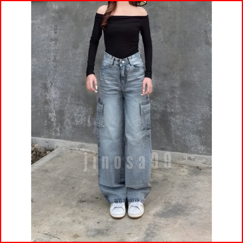 Celana Jeans Cargo Baggy Highwaist Oversize Korean Style Denim Terbaru