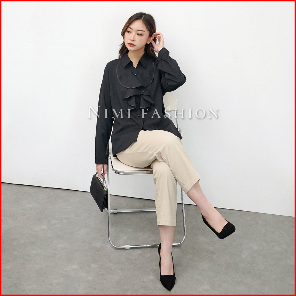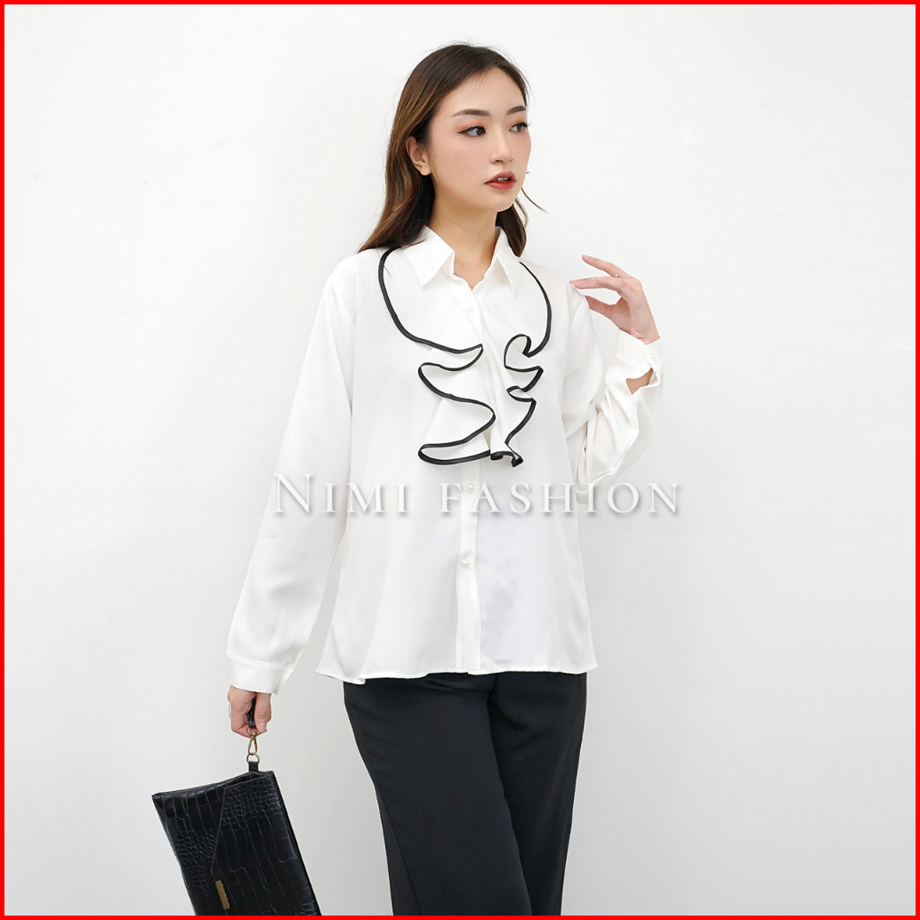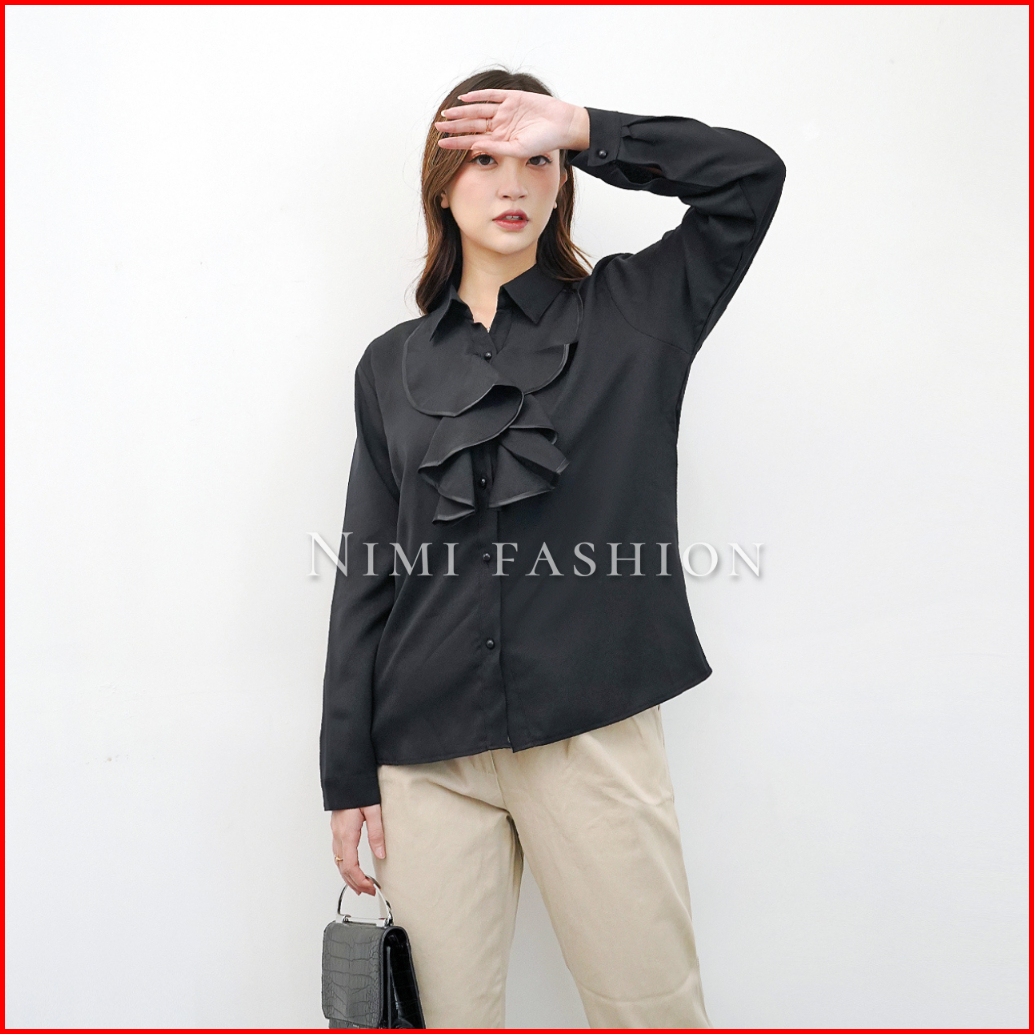 Nimi - Kemeja Putih Wanita Rumbai Dada Lengan Panjang Formal Rempel Renda Dada Kantor Wanita