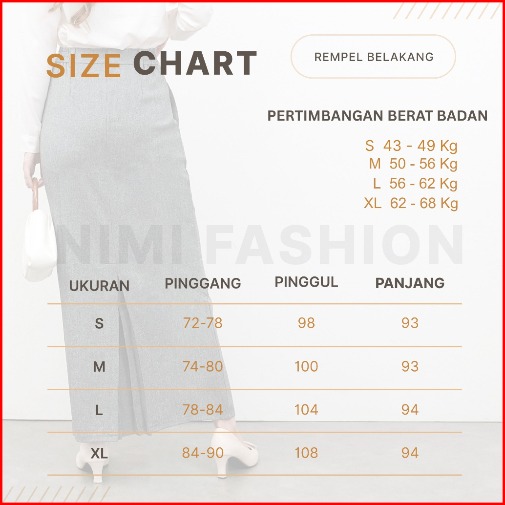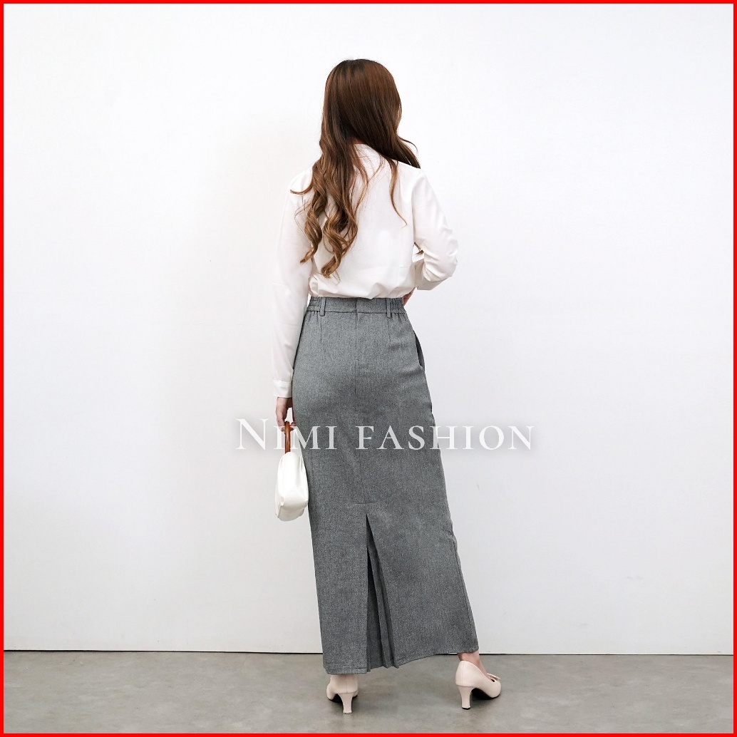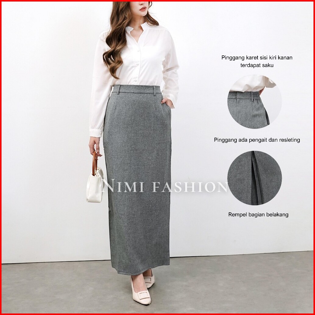 Nimi - Rok Span Panjang Wanita Kantor Pinggang Karet Sisi Samping Belah Rempel Belakang Bahan Impor Stretch