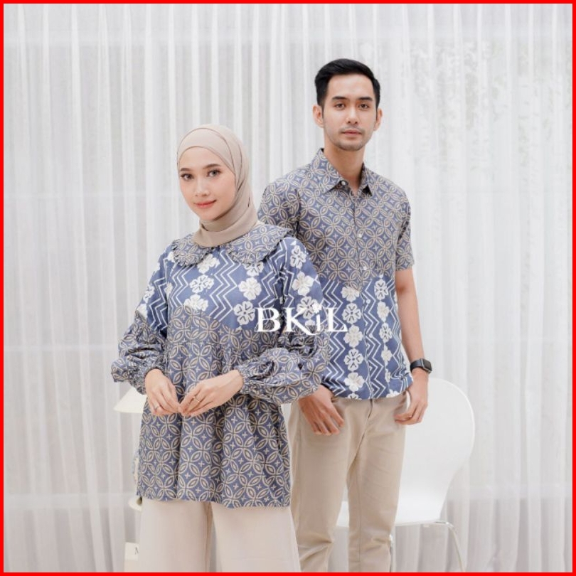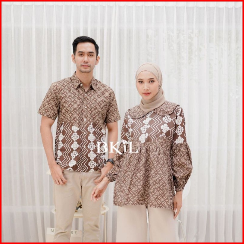 Atasan Batik Couple Modern Blus Lengan Balon Kemeja Hem Lengan Pendek Busui Friendly Motif Kawung Atasan Kerja Seragam K