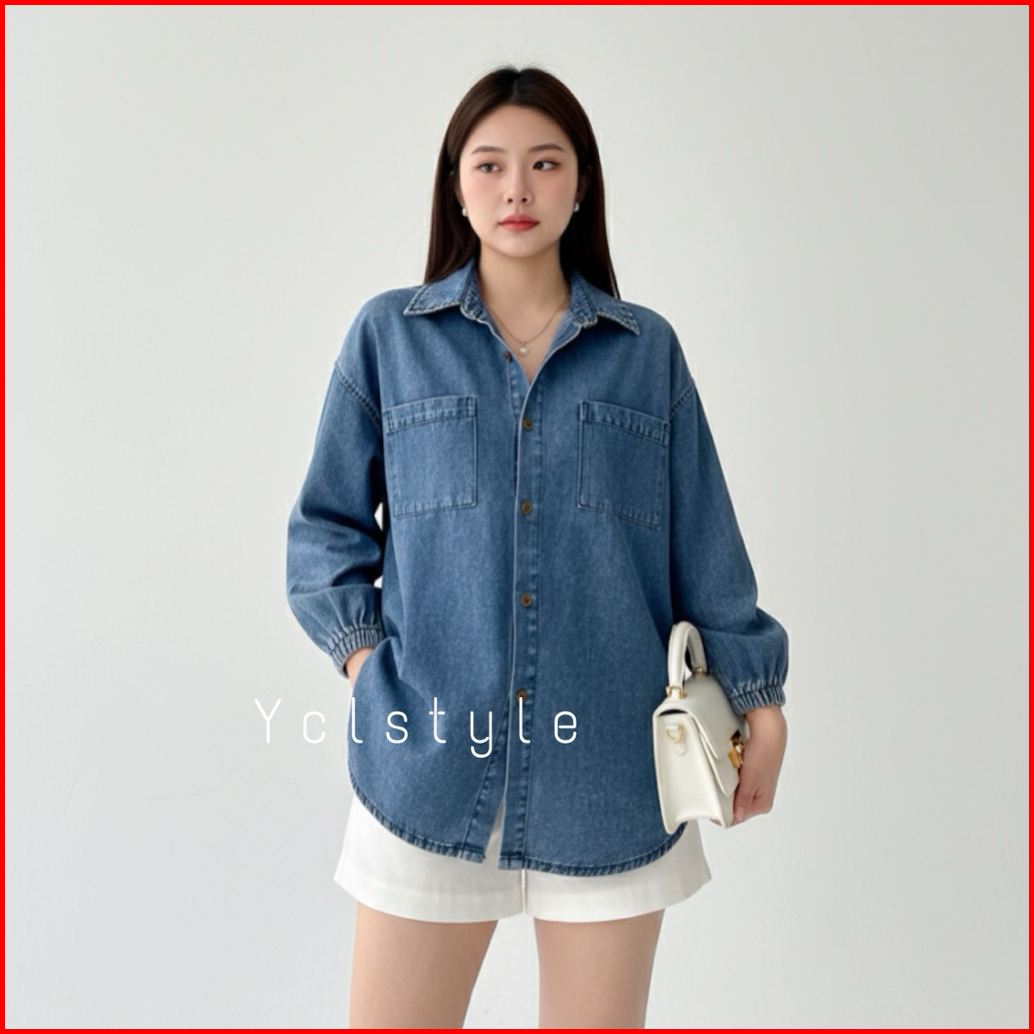 Ycl Monita Soft Denim Shirt Kemeja Denim Kasual Wanita Kemeja Denim Lengan Karet Kantong Dua Kemeja Denim Wanita