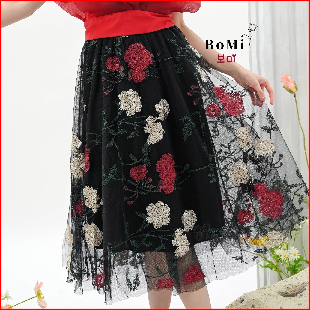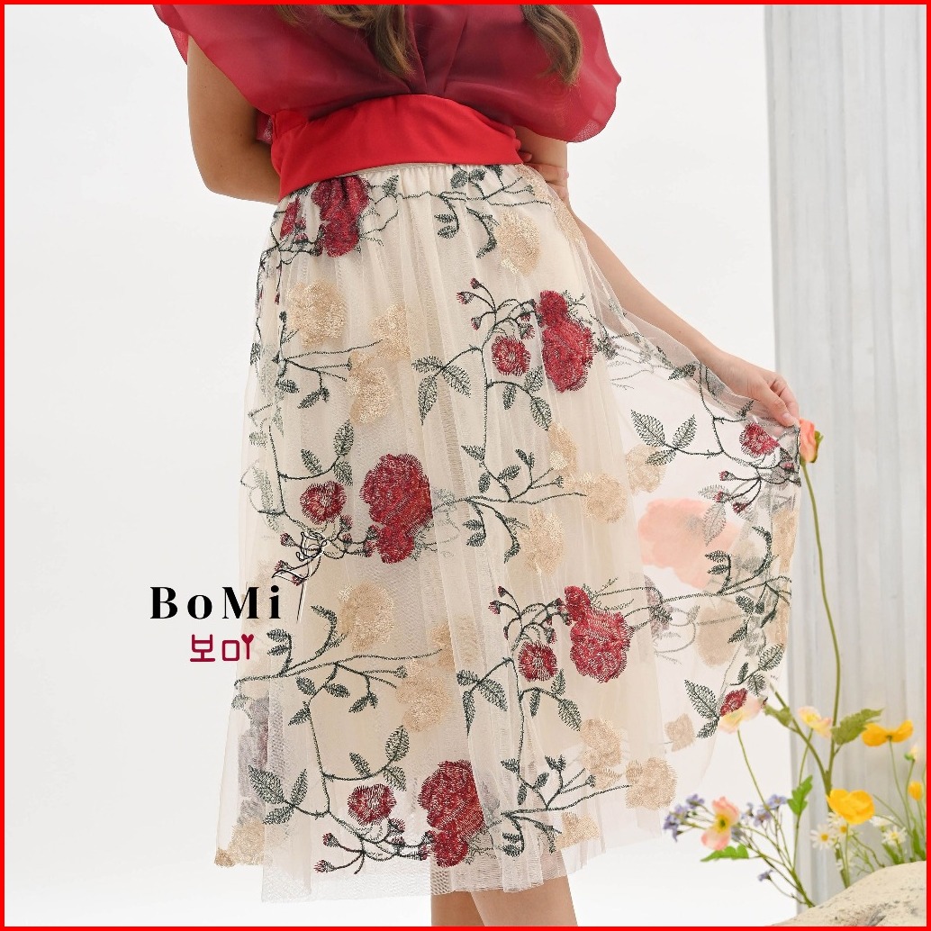 Bomi - Rose Skirt Flower Mawar Korean Premium Rok Tutu Tile Motif Timbul Bunga 3 Lapis Dengan Furing