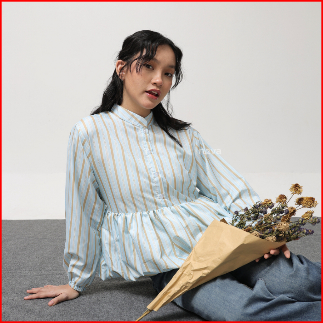 Neva Style - Orlin Blouse Balon Stripe Ruffle Atasan Kemeja Stripe Wanita Lengan Panjang Katun
