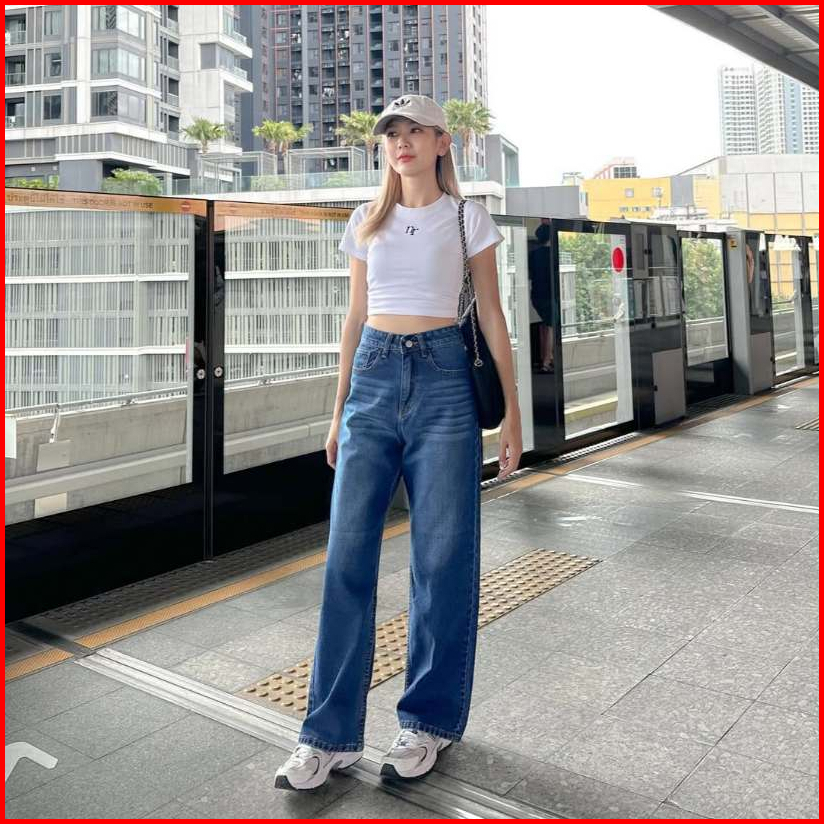Celana Jeans High Waist Wanita Korean Style Jeans Baggy Pants Serbaguna Kasual Biru Retro
