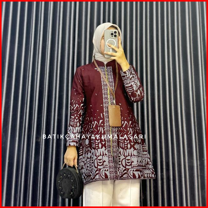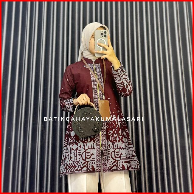 Atasan Tunik Pendek Wanita Lapis Trikot Motif Maheswari Burgundy - Batik Kerja Wanita Warna Burgundy