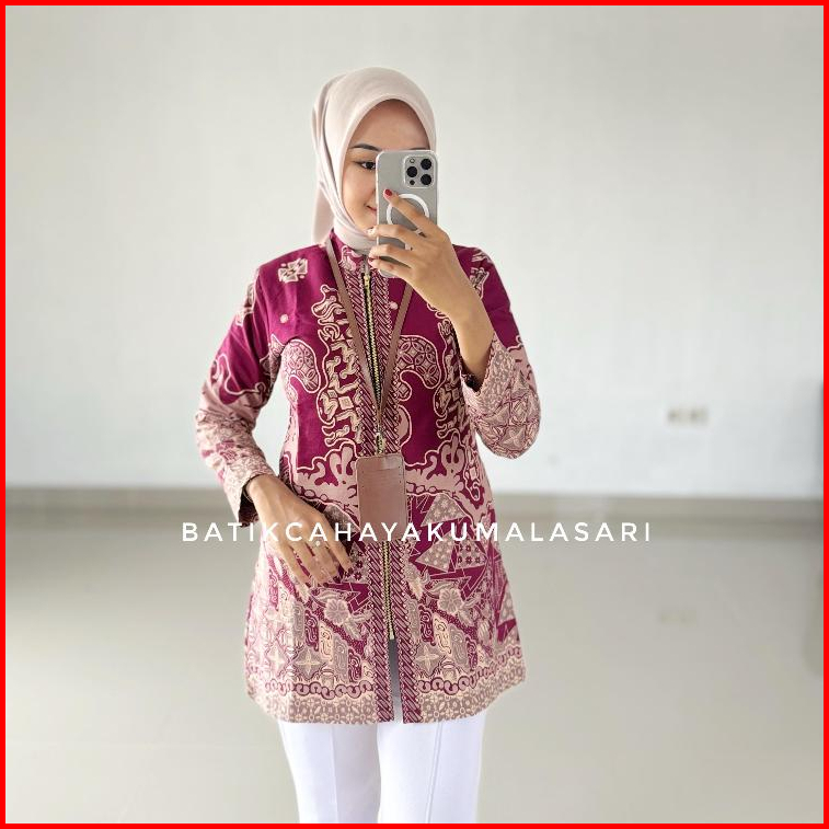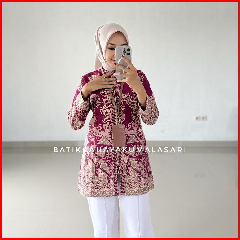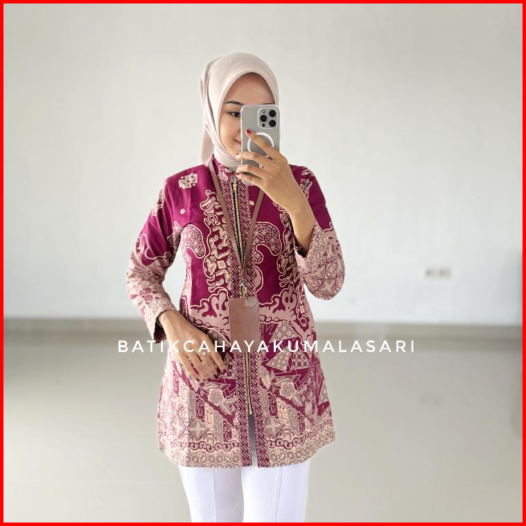 Tunik Pendek Batik Wanita Lapis Trikot Motif Delima Merah - Atasan Kerja Wanita Bahan Katun Prima