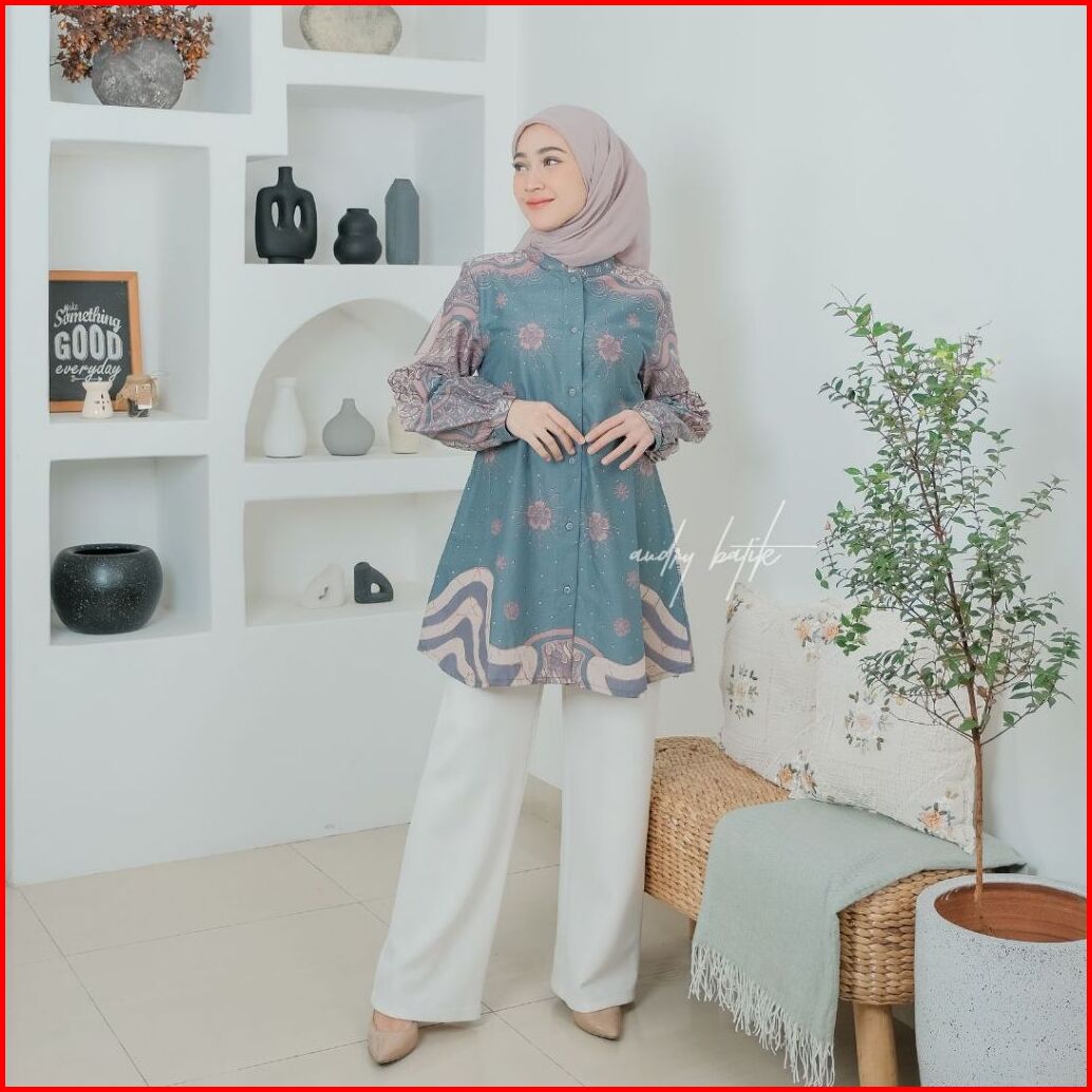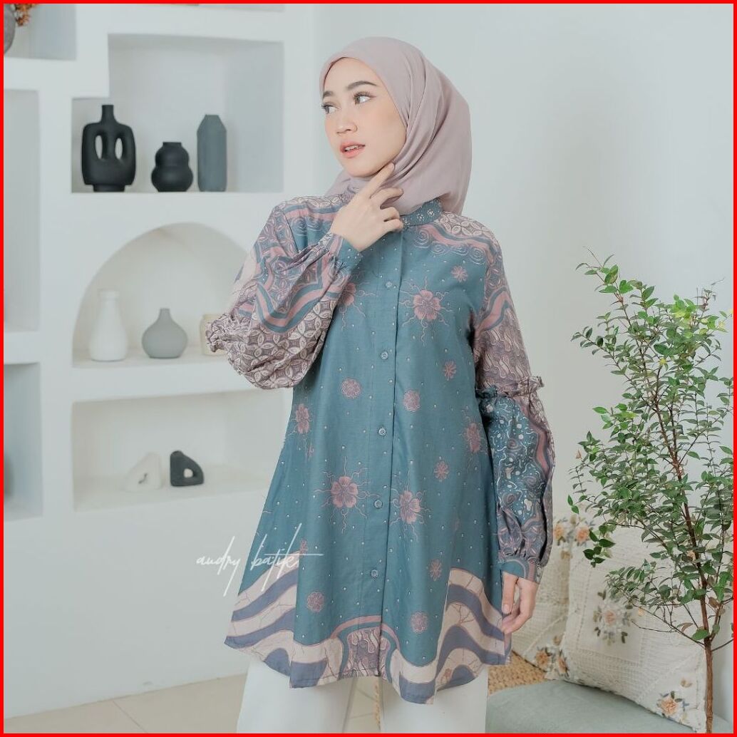 Audry Batik - Maharani - Blouse Batik Kerja Wanita Panjang Hijab Modern Kawung Bunga Mustard Tosca