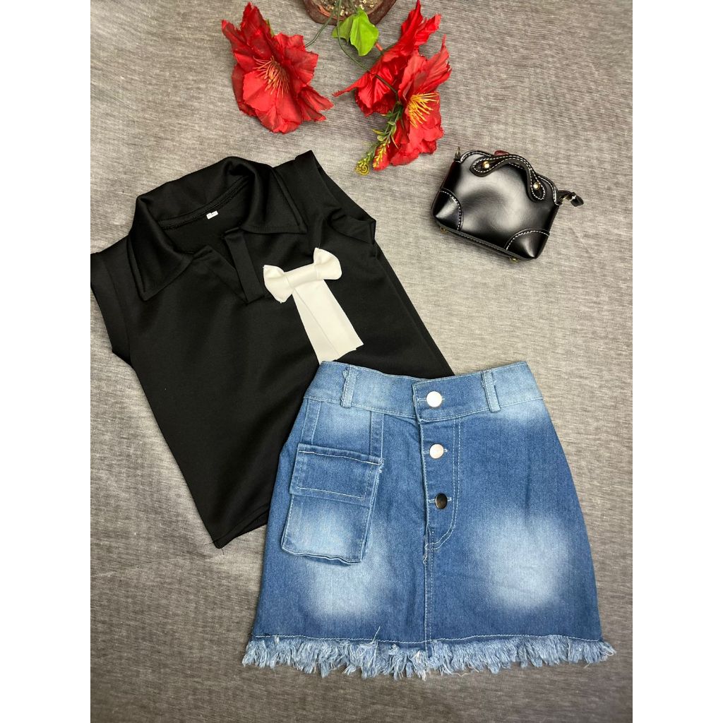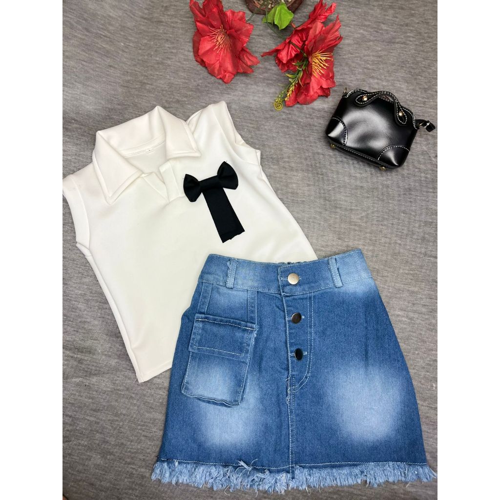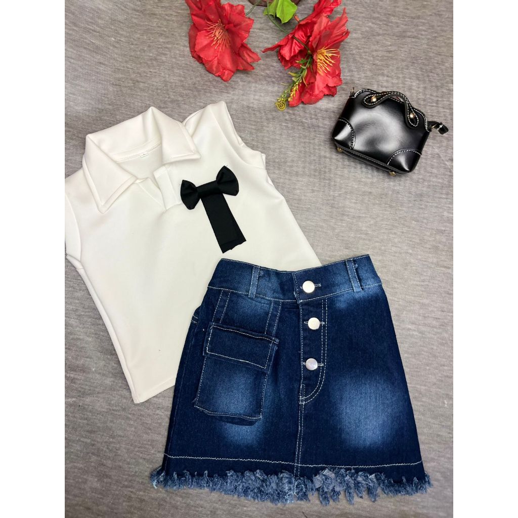 Rok Jeans Anak Setelan Pita Anak Kekinian Fashion Korean Style Rok Jeans Putih dengan Lengan Hitam dan Rok Jeans
