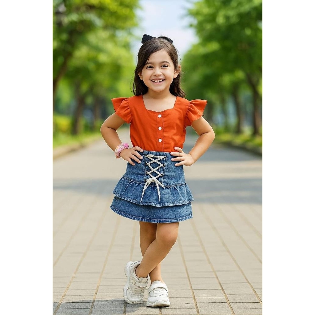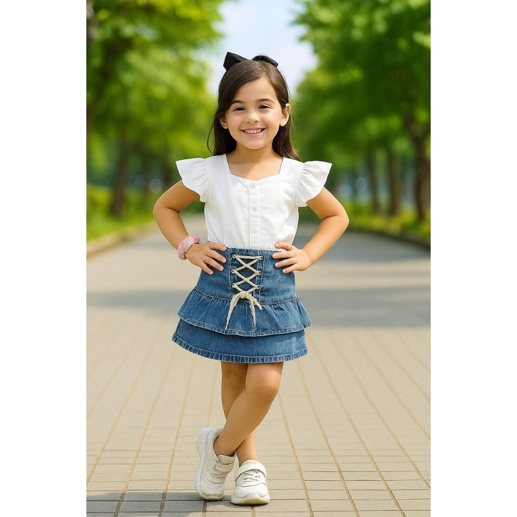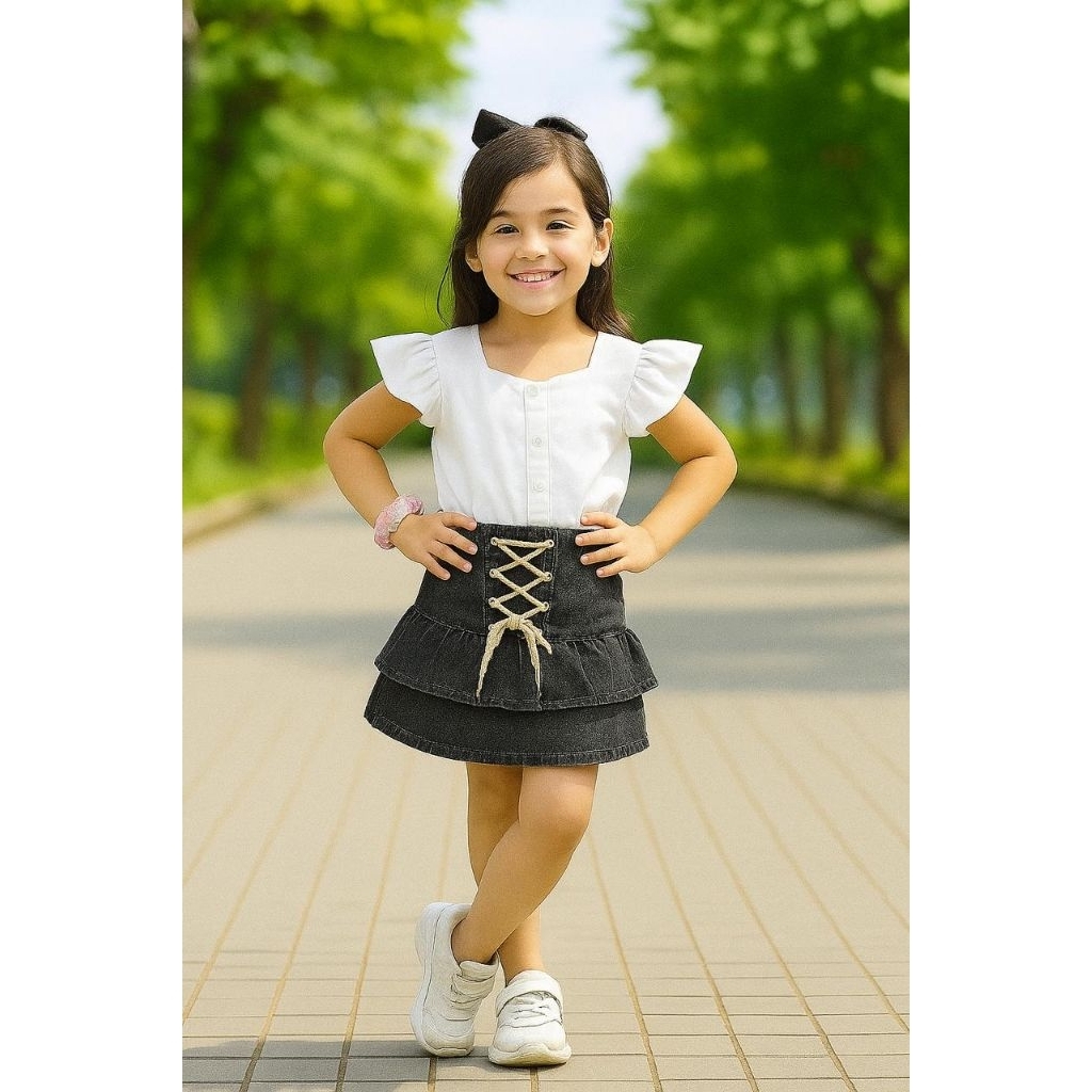 Rok Jeans Anak Setelan Anak perempuan Rok mini jeans Susun Rihana +Atasan katun lucu casual Imut untuk jalan santai dan