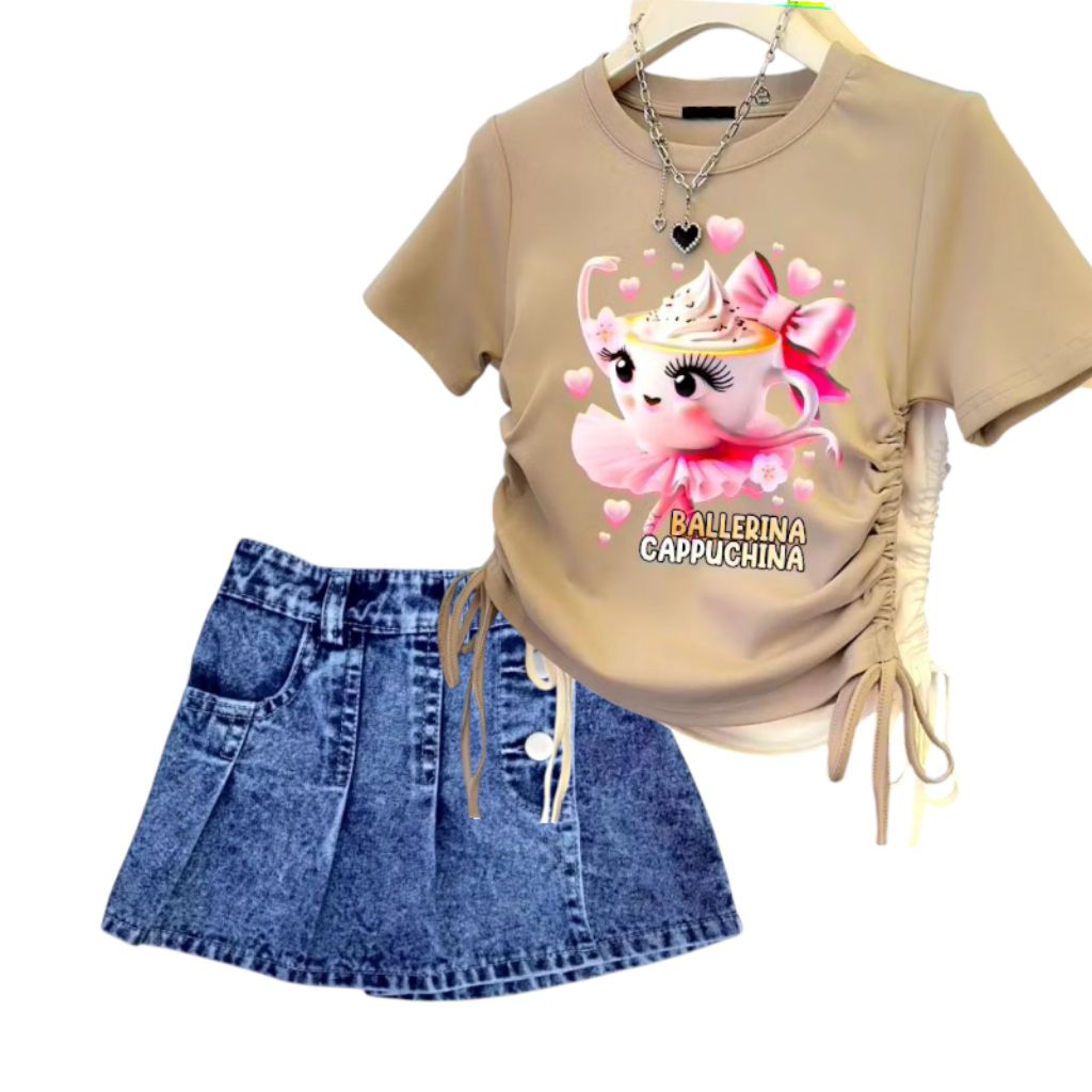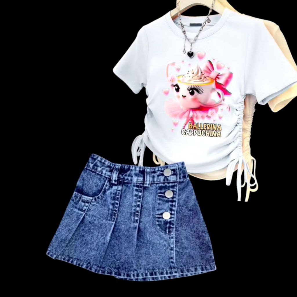 Rok Jeans Anak Setelan Anak Perempuan Rok Jins Atasan Kaos Gambar Ballerino Capuchina 1-7 tahun s