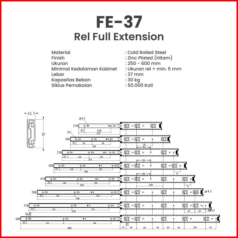 1 Pasang Rel Laci Huben Fe 37 Double Track Full Extension Fe37 Size 25 Cm 30 Cm 35 Cm 40 Cm 45 Cm 50 Cm 55 Cm 60 Cm