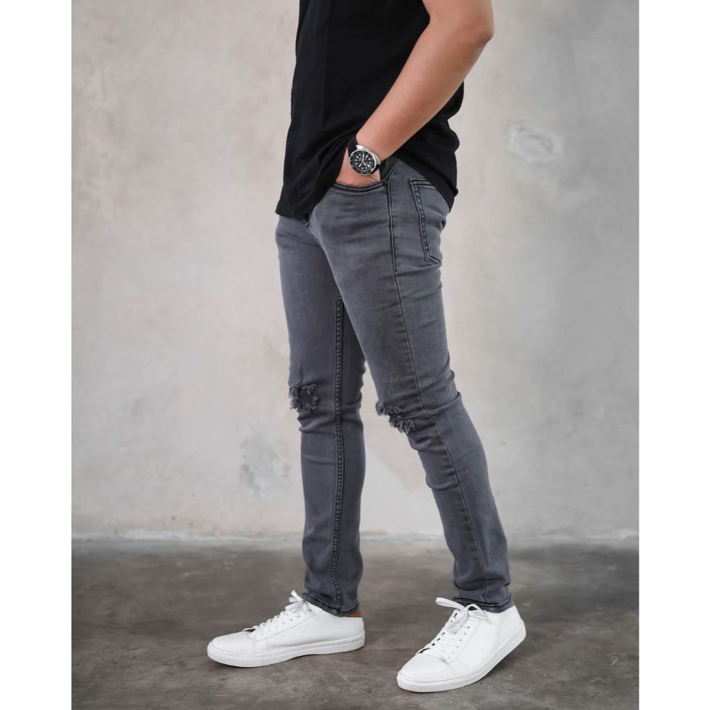 Celana Jeans Panjang Pria Sobek Lutut Slimfit Skynni Pensil Hitam Ripped Denim Stretch Melar