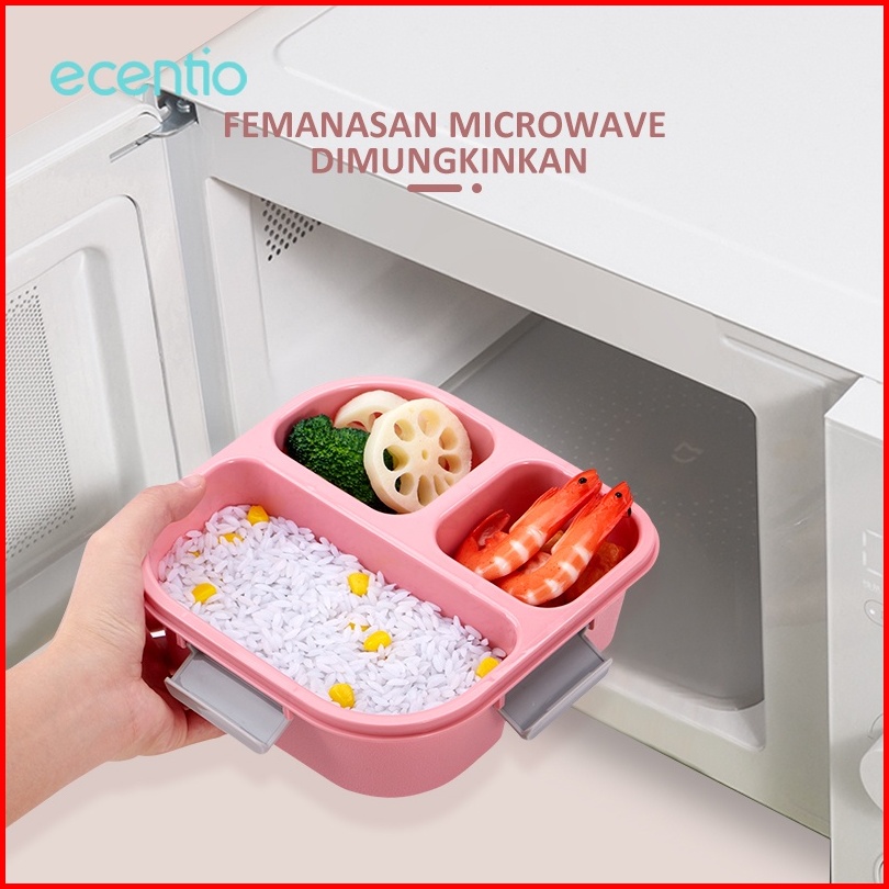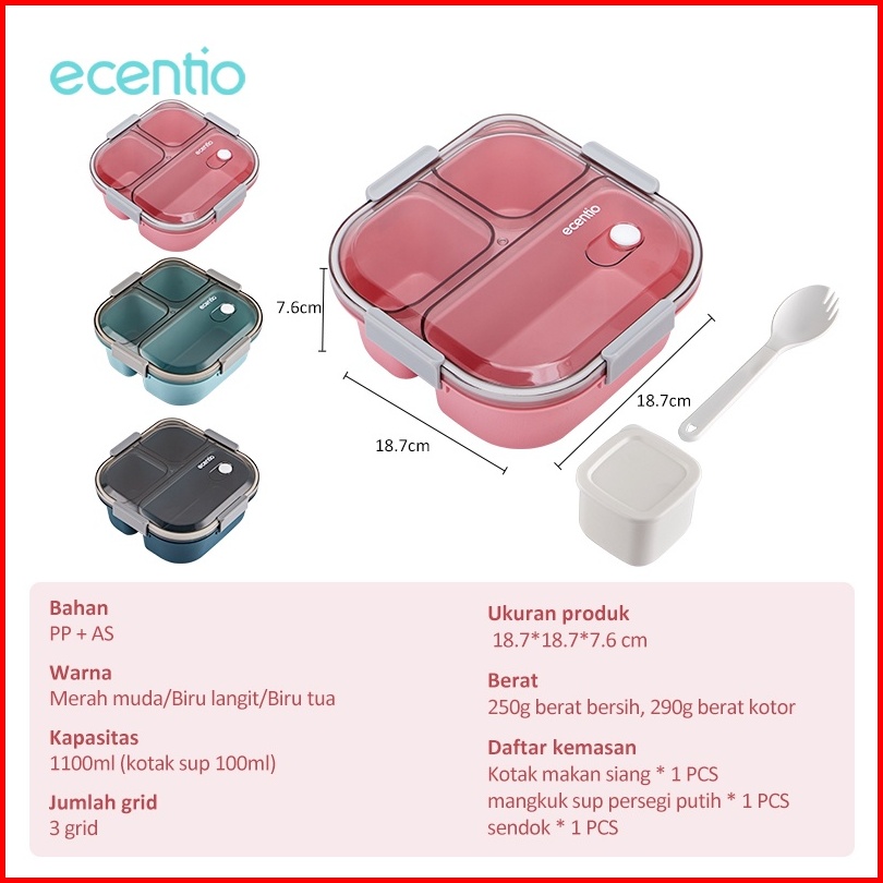 Ecentio Kotak Makan 3 Grid 1100ml Anti Tumpah Kotak Bekal Kotak Sup 100ml Free Sendok Lunch Box