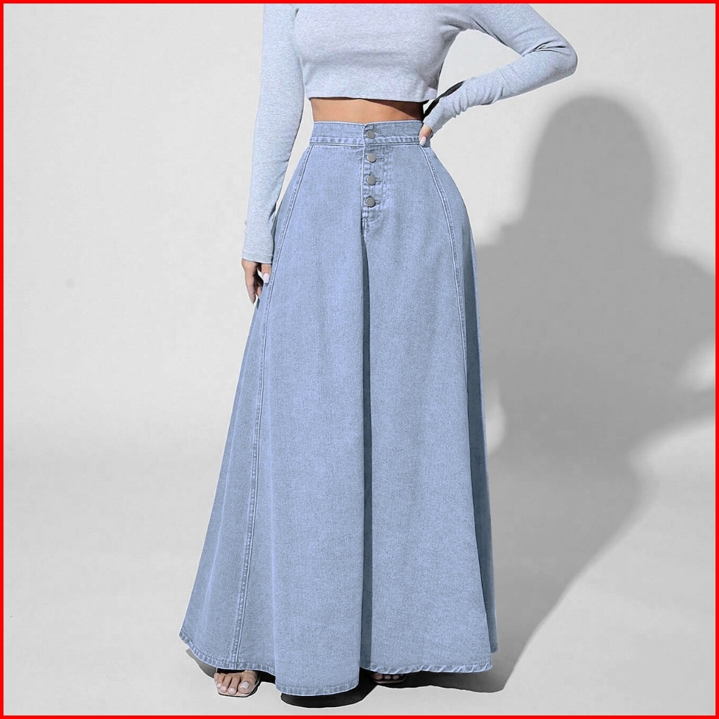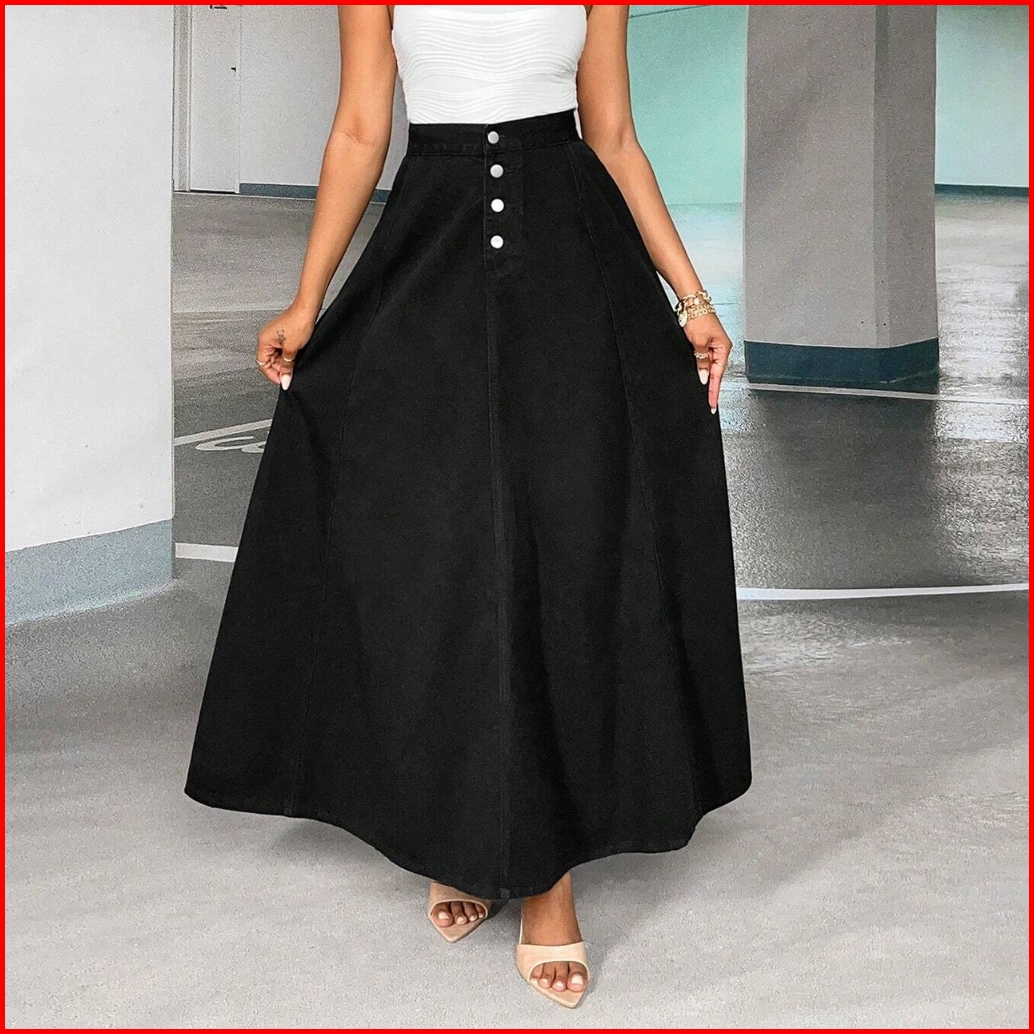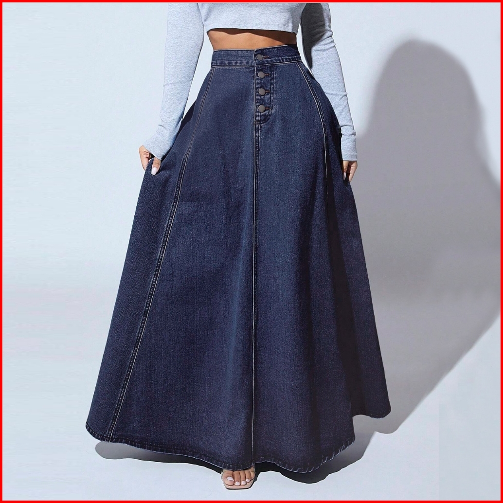 Denim Skirt For Wanita Multiple Buttons Highwaist Retro Loose Large Swing Maxi Skirt