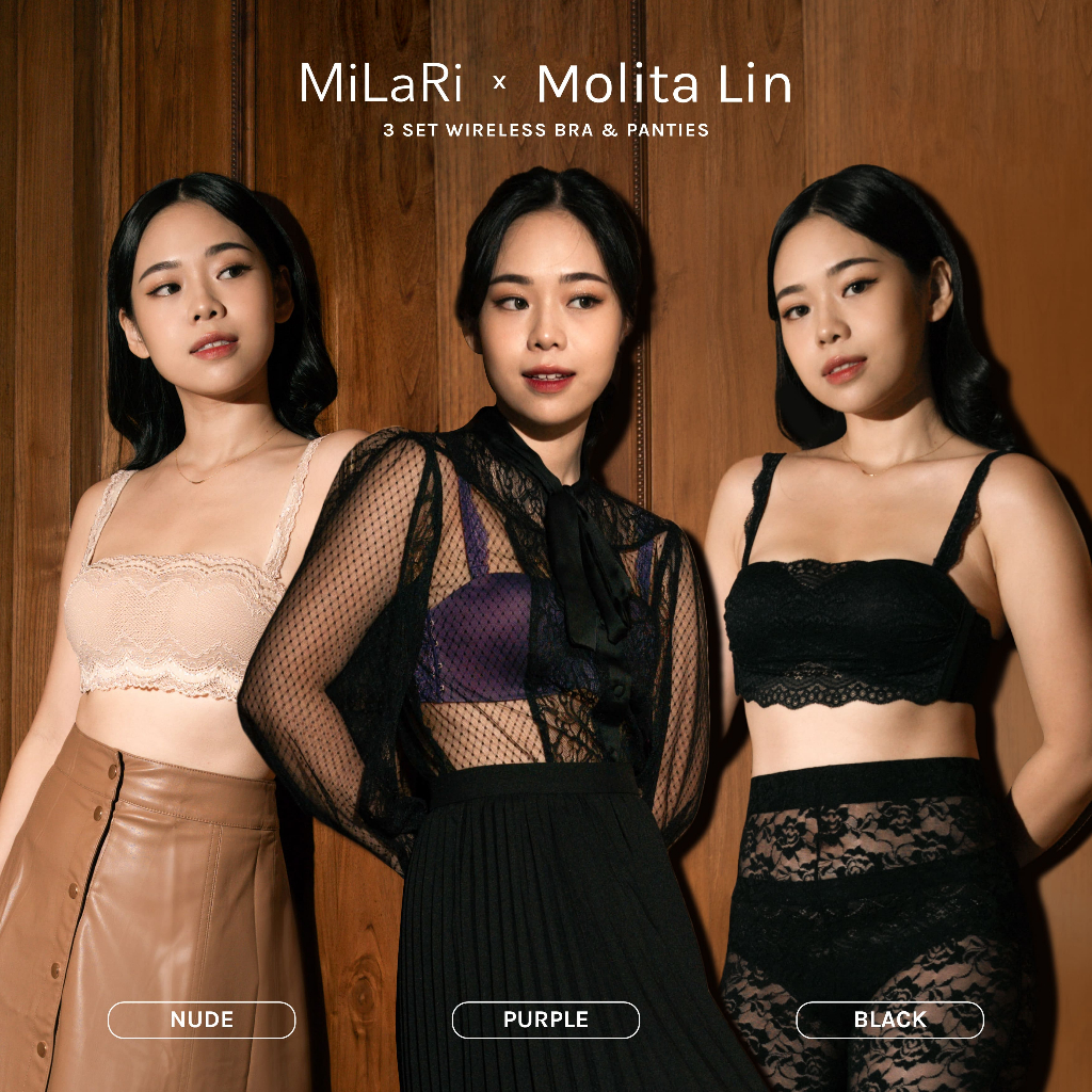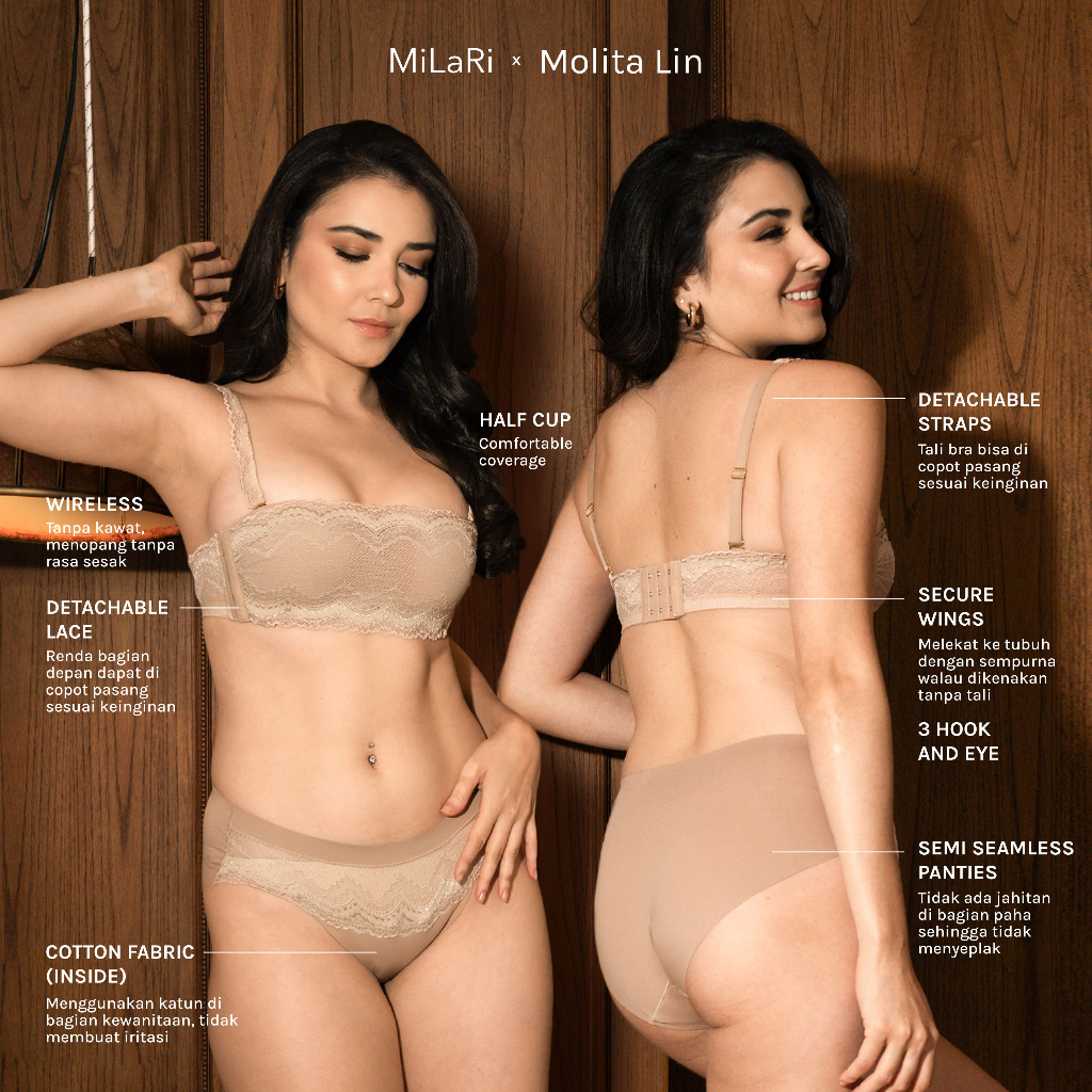 Milari x Molita Lin Bundle 3set Bra Tanpa Kawat Push Up dan Panty Anti Camel Toe, Free Travel Pouch