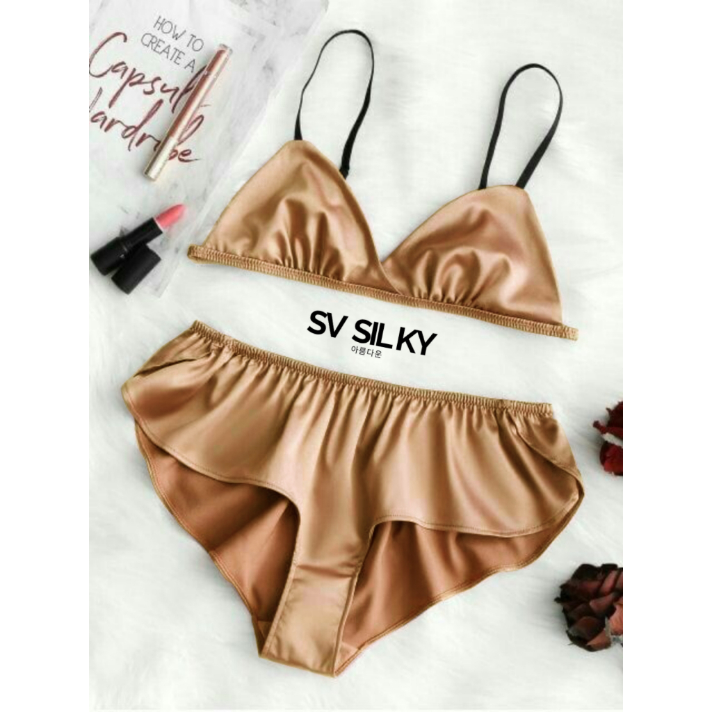 Set Bra dan Celana Dalam Wanita Bahan SV Silk Satin Korea Premium – Bra Tanpa Kawat dengan Cup, Desain Elegan, Adem dan