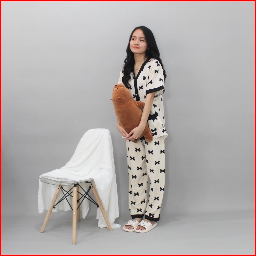 St Vianca Piyama Motif Pita Love Powysuit Bahan Satin Lengan Pendek Celana Panjang Baju Tidur Wanita