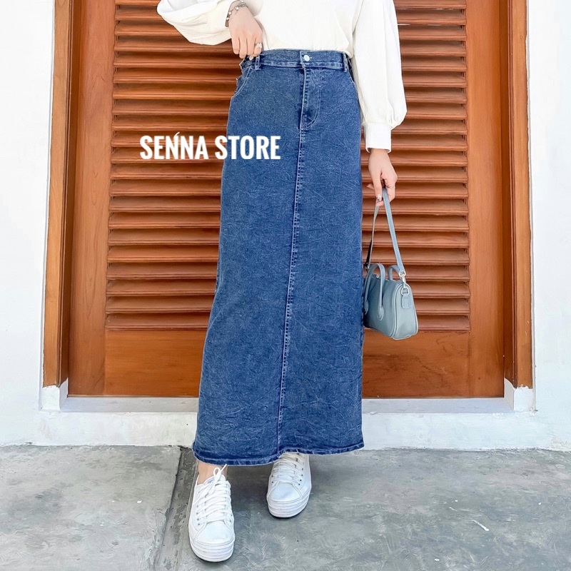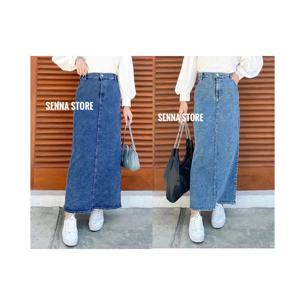 Rok Jeans Panjang Highwaist Rok Jeans Theana Bahan Tebal Allsize