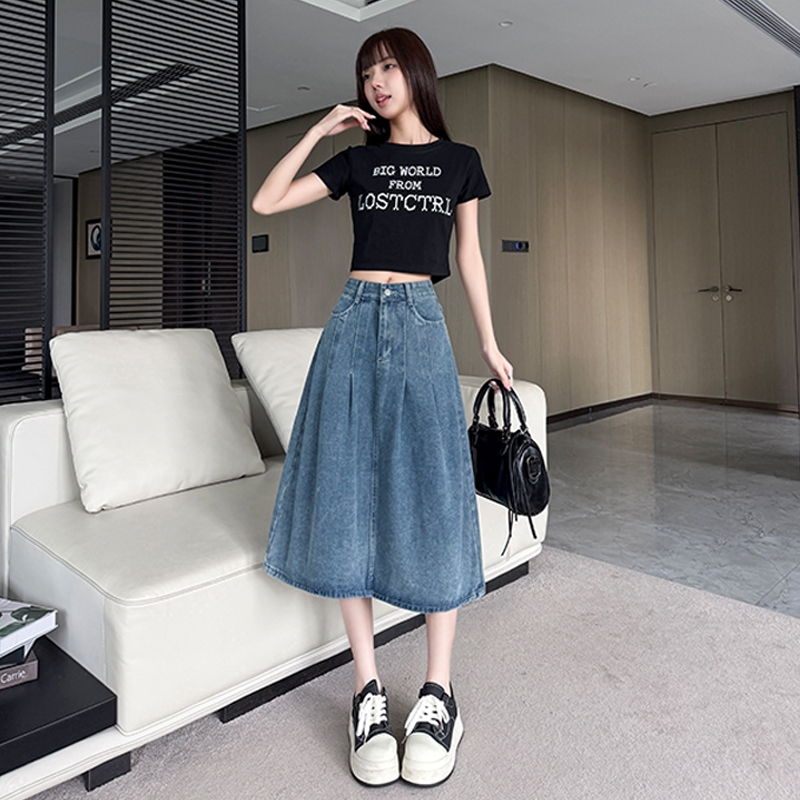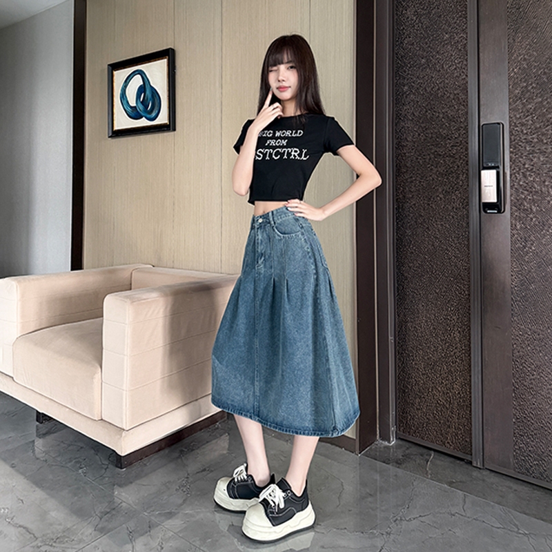Rok Jeans Panjang Rok Jeans Vintage Cucian Korea, Rok Midi Lipit Pinggang Tinggi, Rok Payung Jeans Wanita Pinggang Tingg