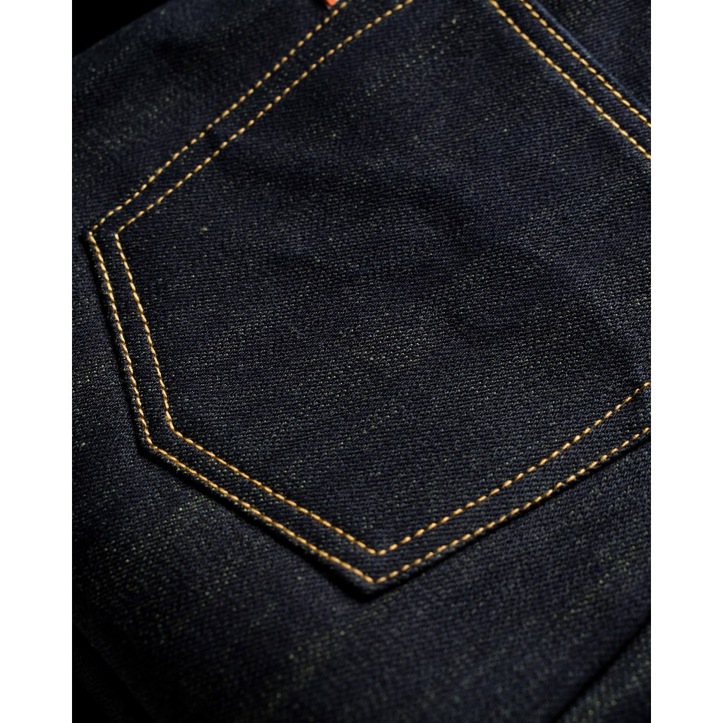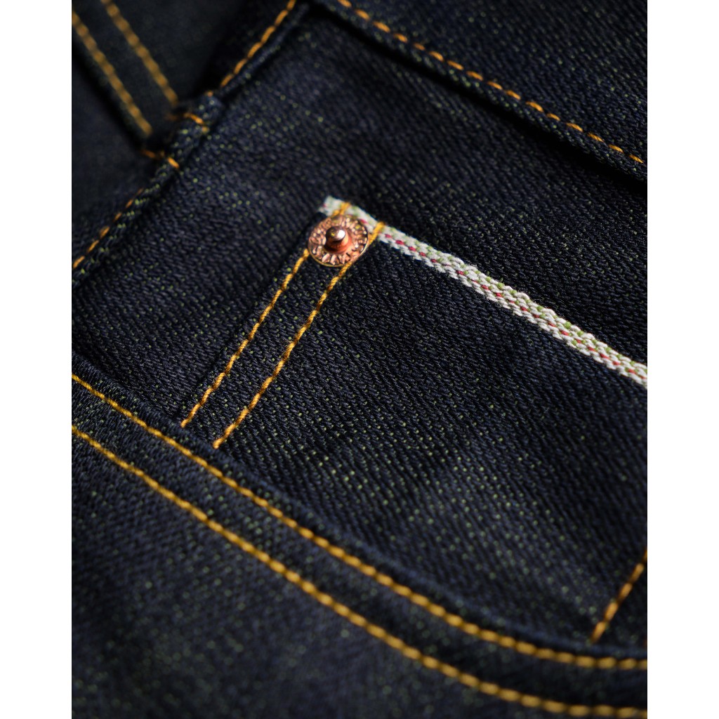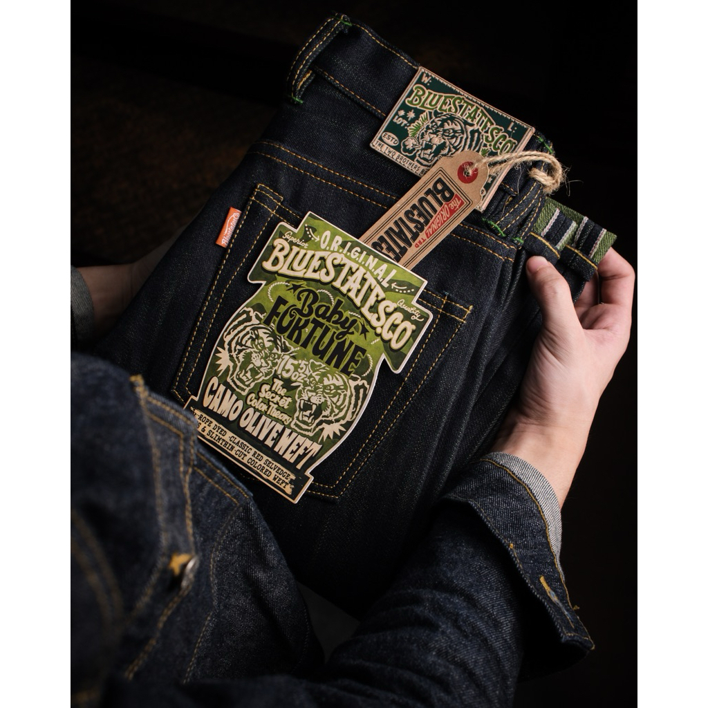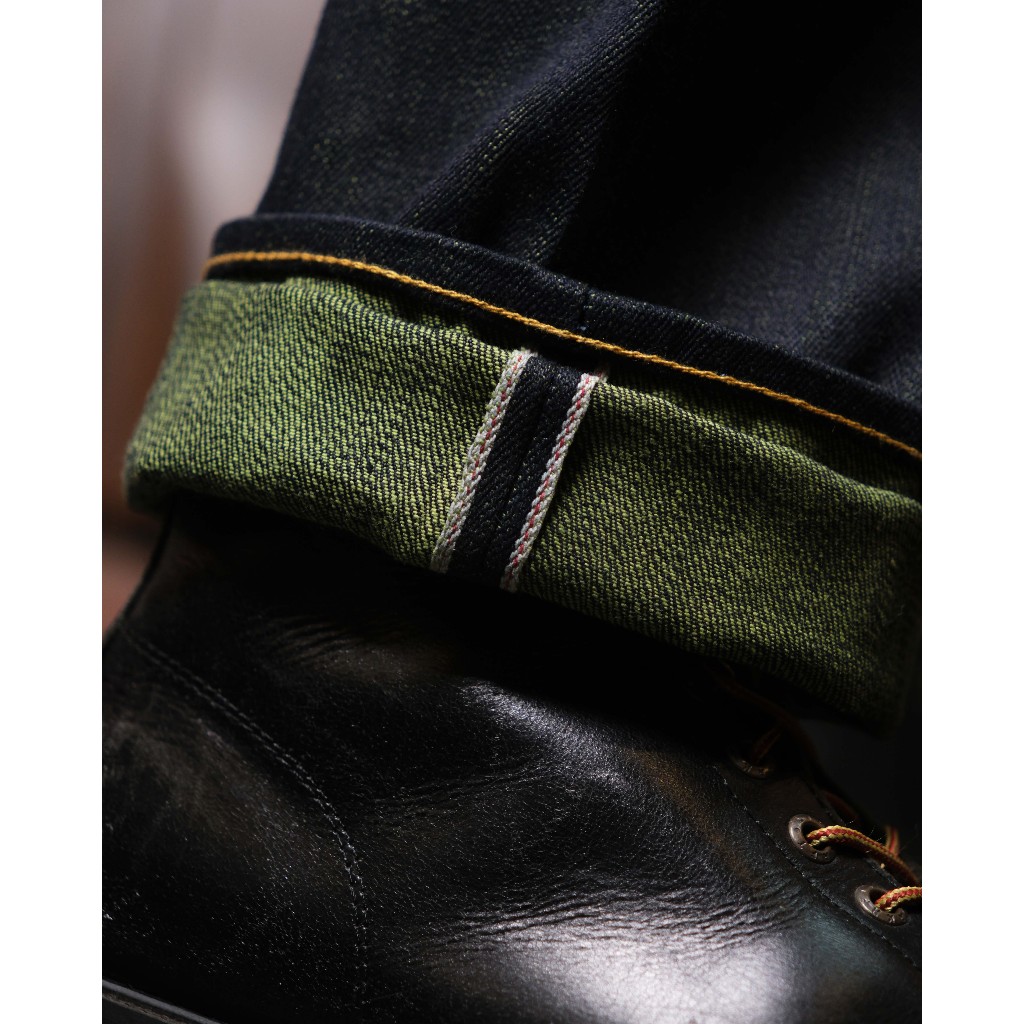 Raw Selvedge Denim - Baby Fortune 15.5 oz vintage indigo Camo Olive Green Weft Sanforized Slim Straight / Slim Fit Jeans