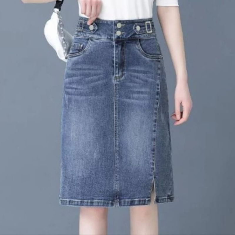 Rok Jeans Pendek Wanita ROK JEANS STRETCH PENDEK / BELAH SAMPING / PINGGANG KARET / M-L-XL