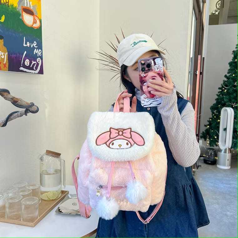 Tas Ransel Premium Bulu Sanrio Melody Kuromi Cinnamoroll Pochacco Tutup Depan Serut Murah Gratis Ongkir
