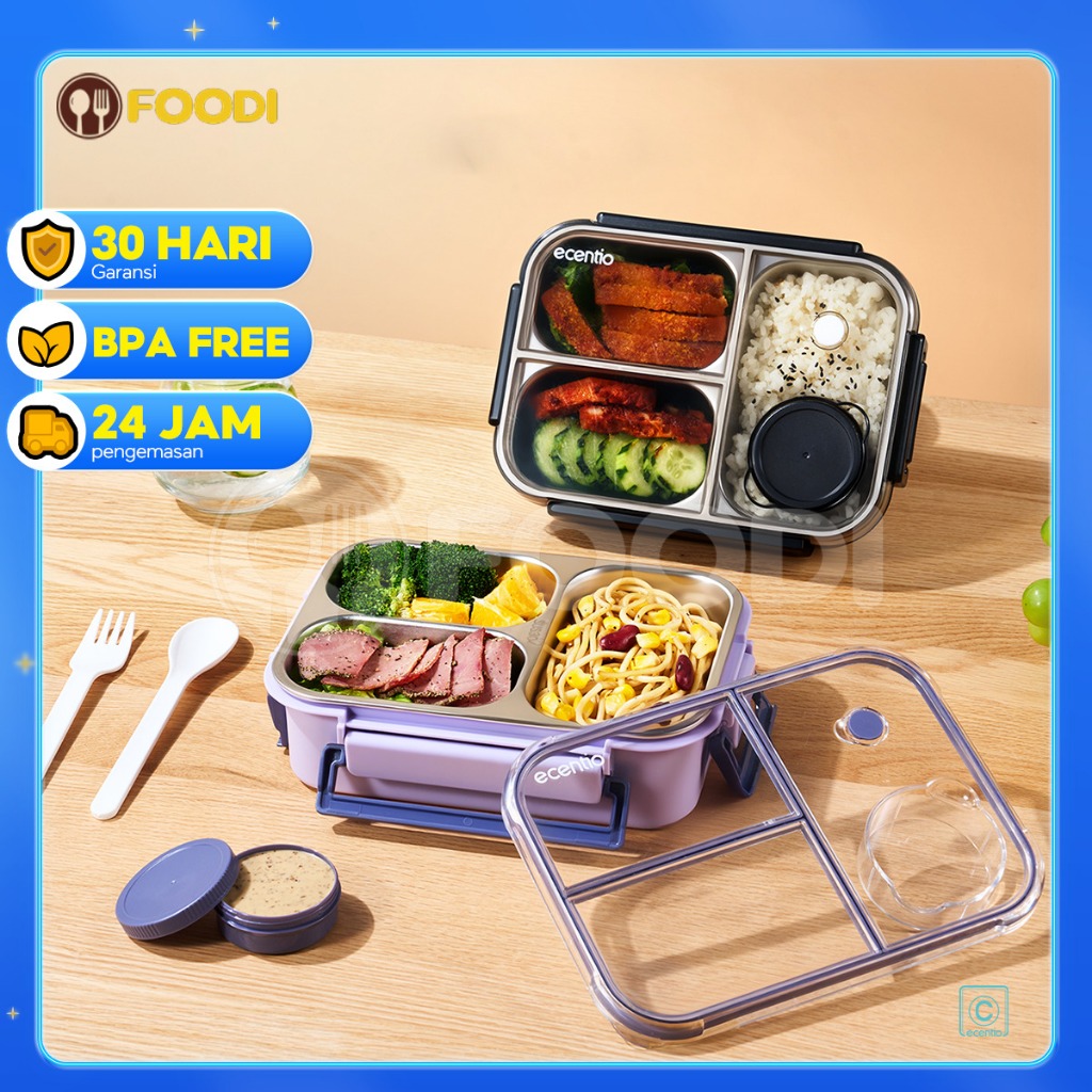 ecentio lunch box stainless/plastic 800ml sekat 3 dengan sendok free kotak sauce kecil