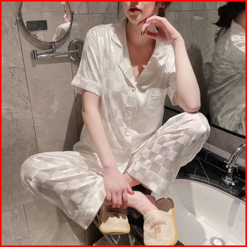 2025 Baru Kotak-kotak Es Sutra Atasan Lengan Pendek Celana Panjang Bisa Dipakai Di Luar Setelan Baju Rumah Piyama Wanita