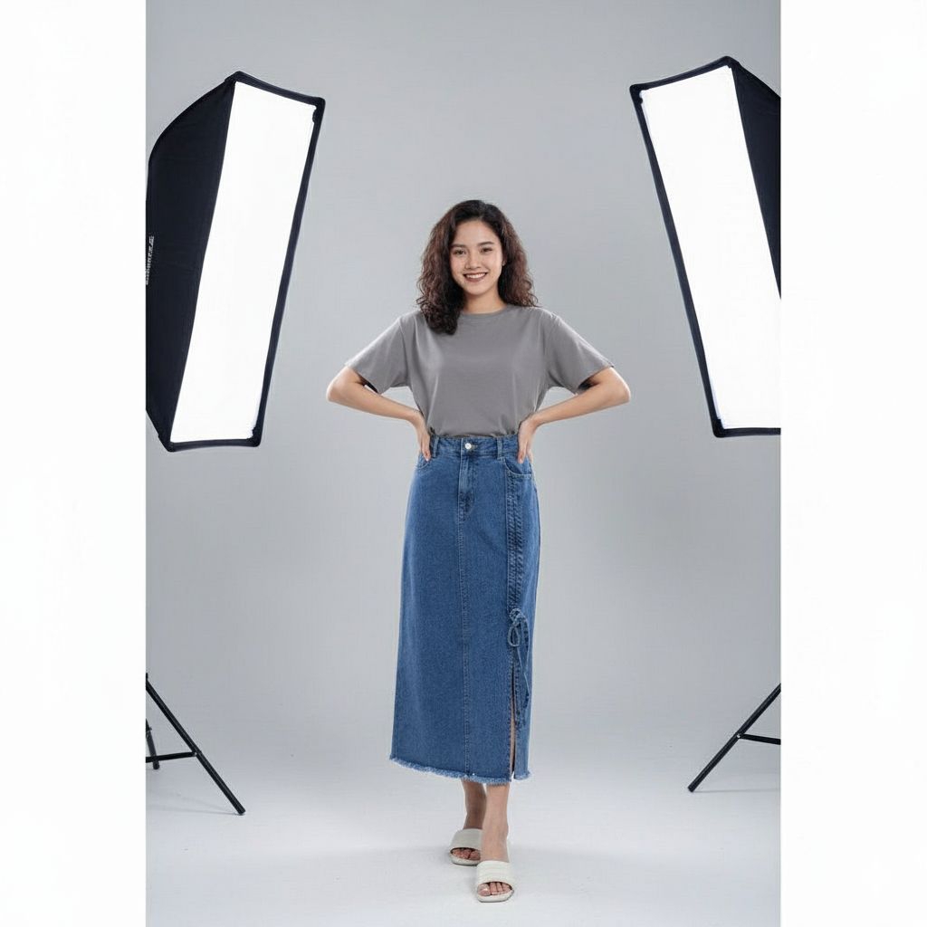 Rok Jeans Panjang Denimmo_Fashion Rok Jeans Serut Korean Style Midi Belah Casual Kekinian