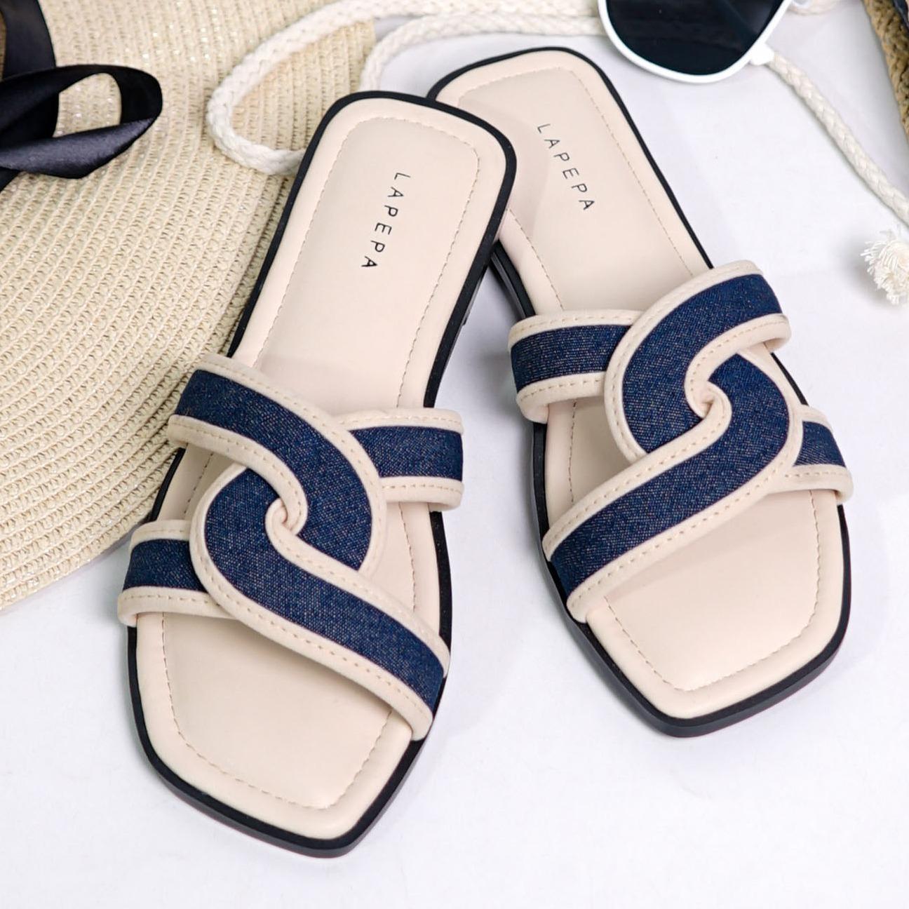 OLLA Sandal Wanita Teplek Korea Casual Size 36 - 40 Sendal Slop Empuk Flat Cewek Kasual Rumahan Warna Hitam Black Cream