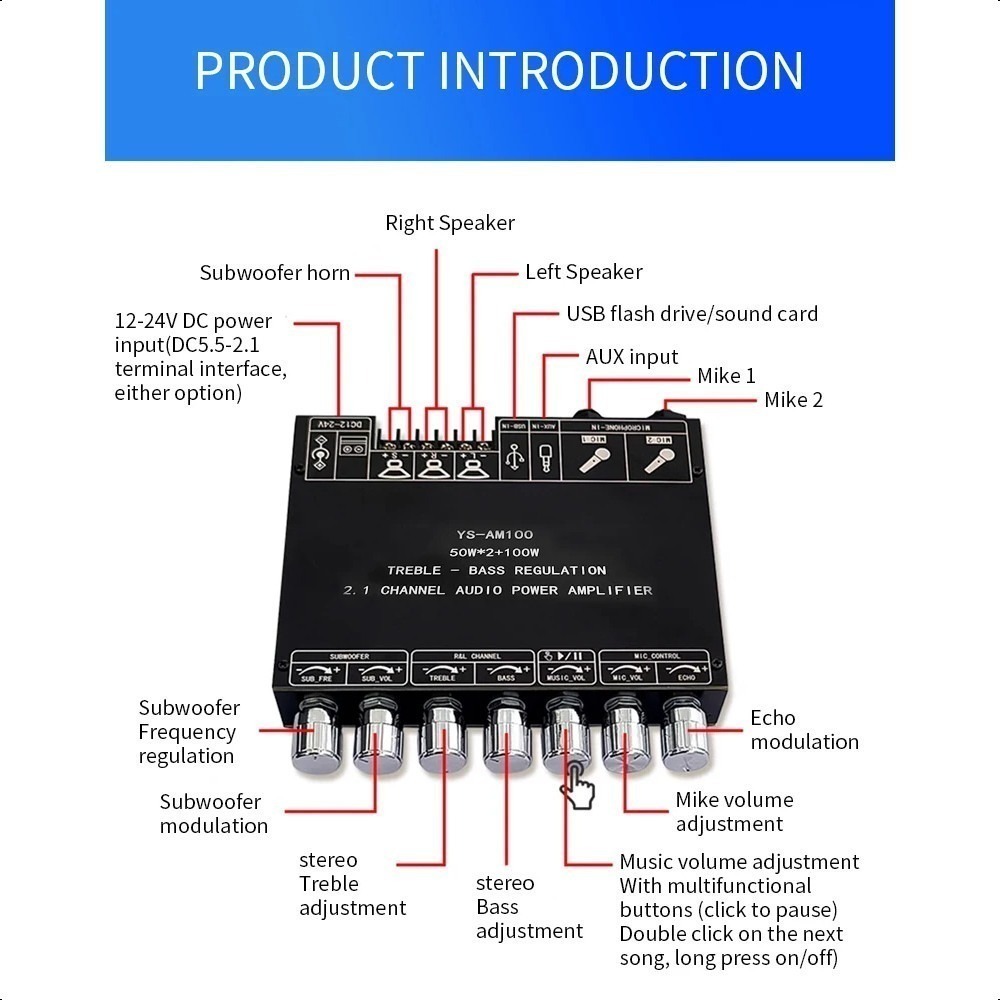 YS-AM100 Papan Penguat Bluetooth Daya Tinggi KTV Mikrofon Suara All-In-One 2.1 Saluran Papan Penguat TPA3116D2