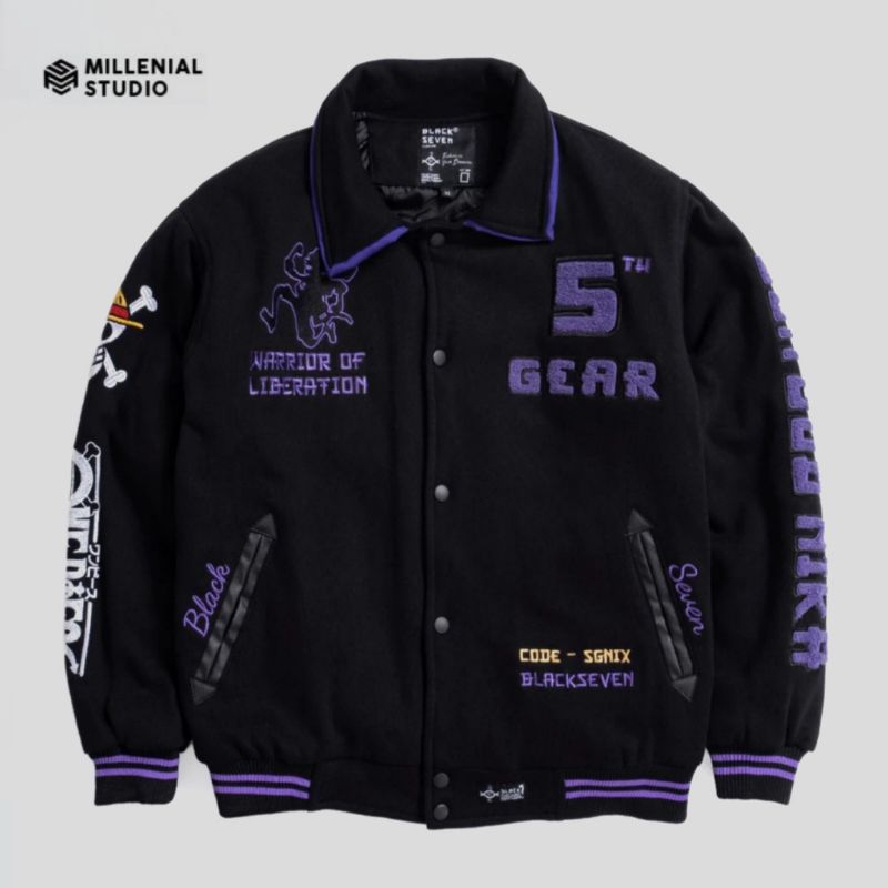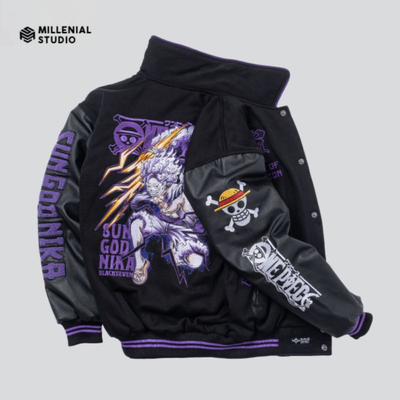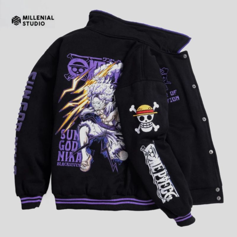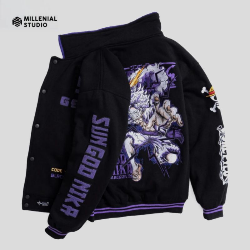 VARSITY JACKET ONE PIECE SUN GOD NIKA LUFFY BLACK PURPLE | GEAR 5 JAKET BASEBALL LIMITED BORDIR KERAH ORIGINAL BLACKSEVE