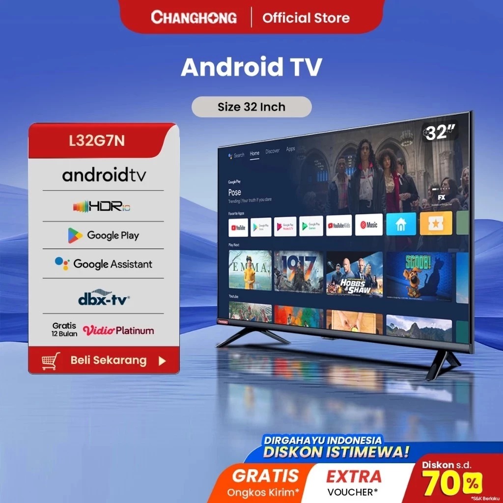 CHANGHONG 32 Inch Newest Android 11 Frameless Smart TV Digital LED TV HD (L32G7N)-Netflix-Youtube