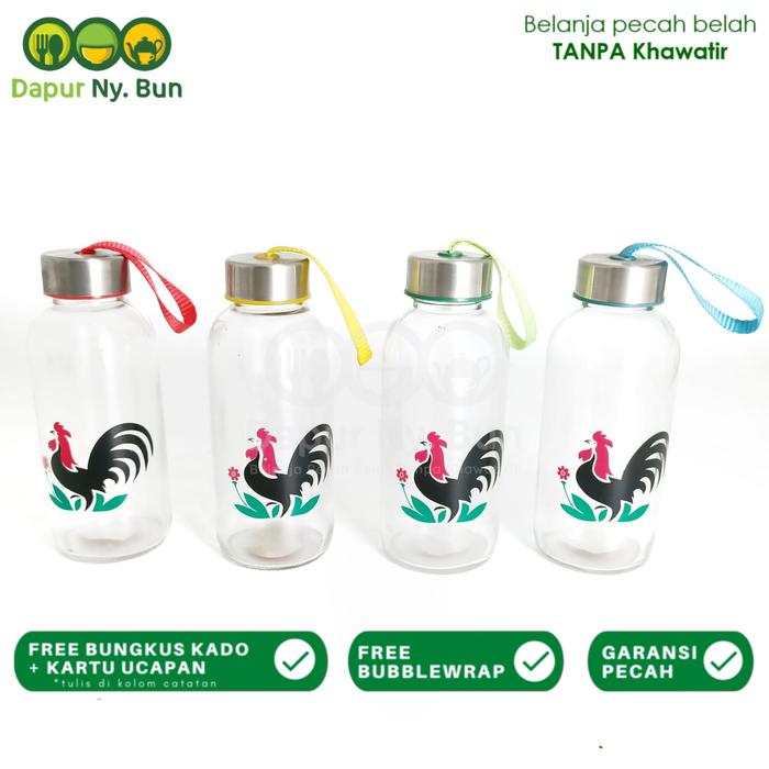 Promo 1 Pc Botol Minum Kaca Motif AYAM JAGO / Botol Kaca - 370ml Elegan