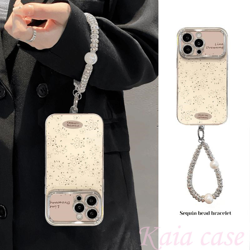 case Shell+bracket+chain iPhone 15 Bunga gambar garis dengan rantai dan kurungan Casing ponsel cocok untuk iPhone