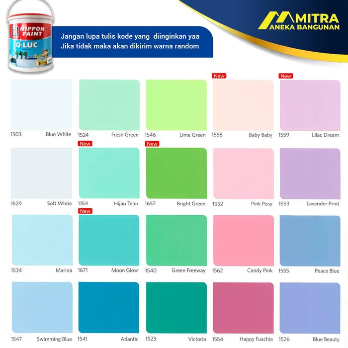 Putih Pastel, baby baby 1558, barley white 1515, blue beauty 1526, blue white 1503, bright green 1657, brilliant white 1502, cafe latte 1556, candy pink 1562, chiffon 1561, copper grey 1549, cream 1518, durian 1514, extra white 1501, fresh green 1524, goby sands 1531, graycloth 1550, green freeway 1540, hijau telor 1154, ivory 1117, jasmine 1525, lakestone 1539, lavender print 1553, lilac dream 1559, lily white 1509, lime green 1546, marina 1534, moon glow 1671, peace blue 1555, pink posy 1552, sand storm 1560, soft white 1529, sunset 1516, sunshine 1557, swimming blue 1547, tangerine 1532, tropica grey 1522