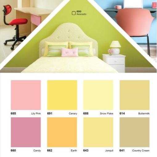 614, 614 Butter Milk, 624, 624 M White, 641, 641 Country Cream, 643, 643 Jonquil, 660, 660 Candy, 661, 661 Leafy, 662, 662 Earth, 663, 663 Azure, 670, 670 Ivory, 680, 680 Green Tea, 681, 681 Cool Dream, 683, 683 Sweet Blue, 685, 685 Lily Pink, 686, 686 Grand Ocean, 688, 688 Snow Flake, 690, 690 Avocado, 691, 691 Canary, 694, 694 Abu-abu, SW, SW Super White