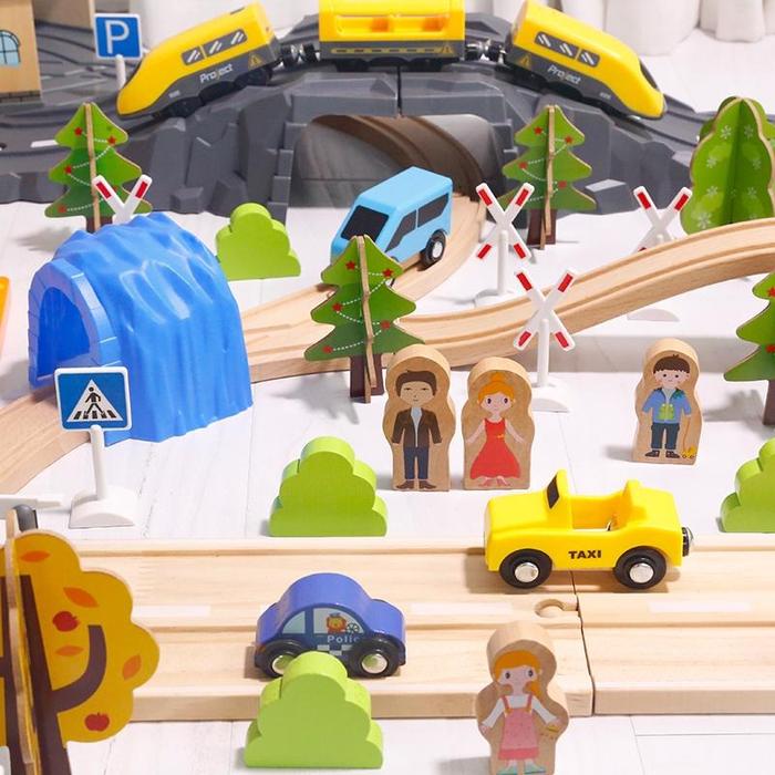 Wooden Train track set building 128 pcs mainan kereta api kayu track