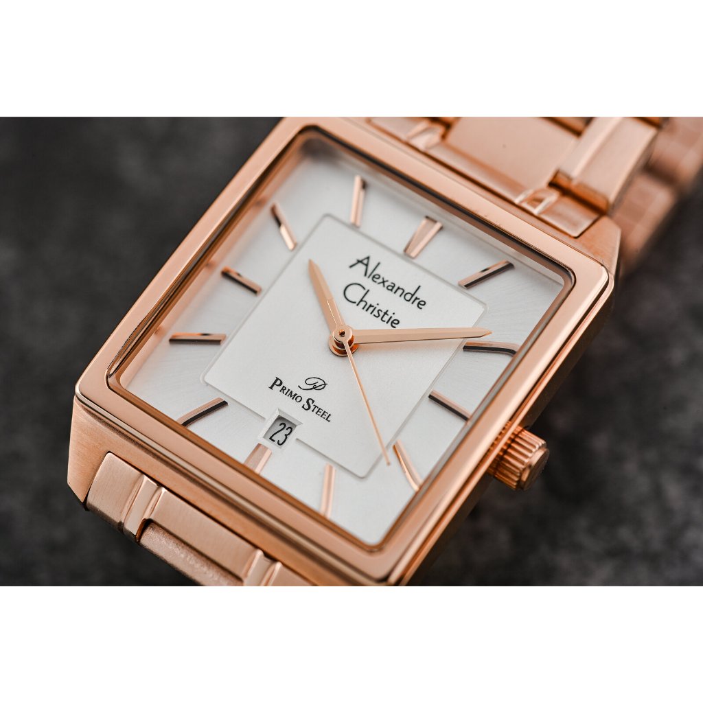 Jam Tangan Wanita Alexandre Christie Primo Steel AC 1038 LD BRGSL Tank Ladies Silver Dial Rose Gold St Steel Strap