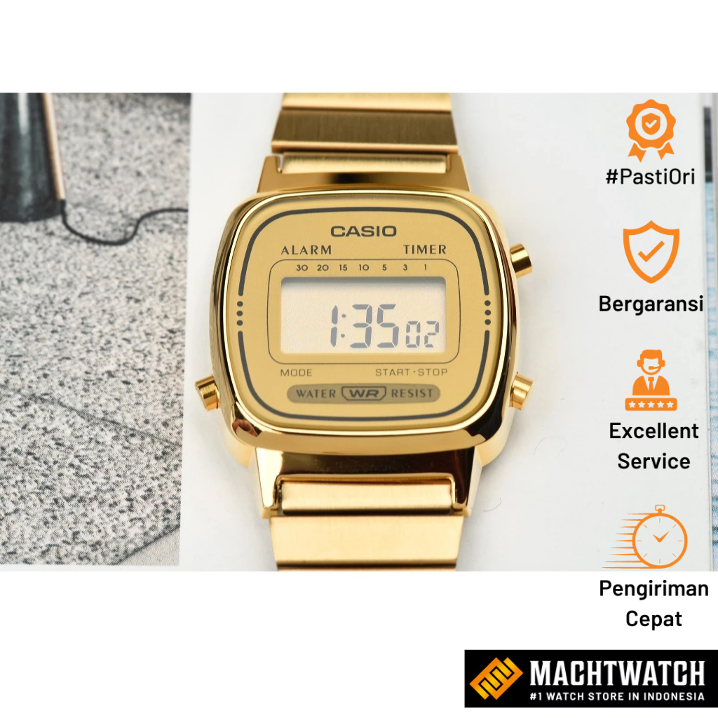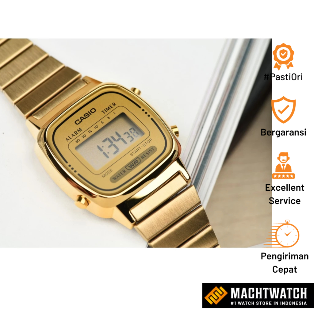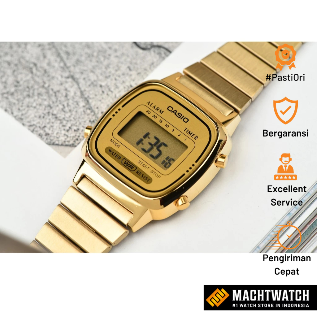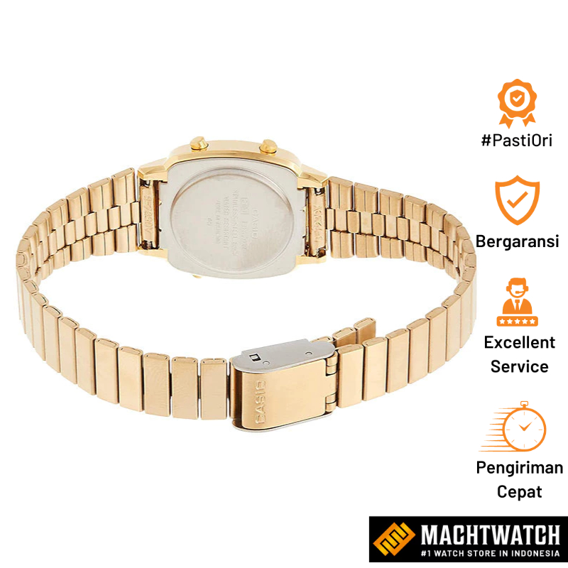 Jam Tangan Wanita Digital Casio Standard LA670WGA-9DF LA670 LA670W Vintage Digital Dial Gold Stainless Steel Band