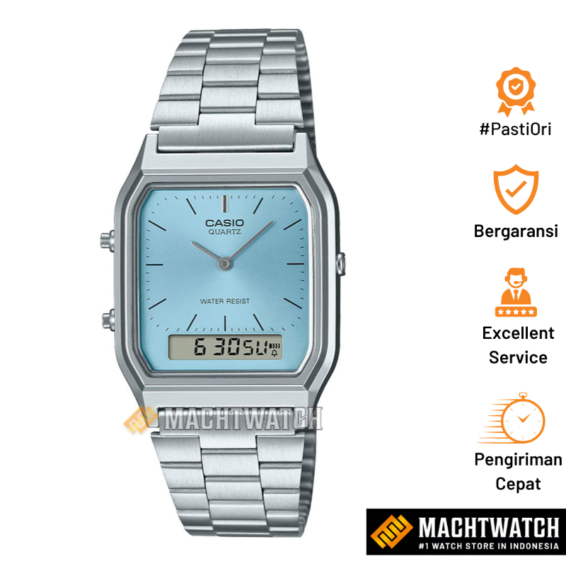 Jam Tangan Unisex Casio General AQ-230A-2A1MQYDF AQ230 AQ-230A Vintage Digital Analog Blue Dial Stainless Steel Band